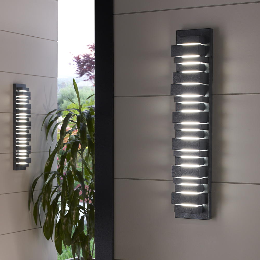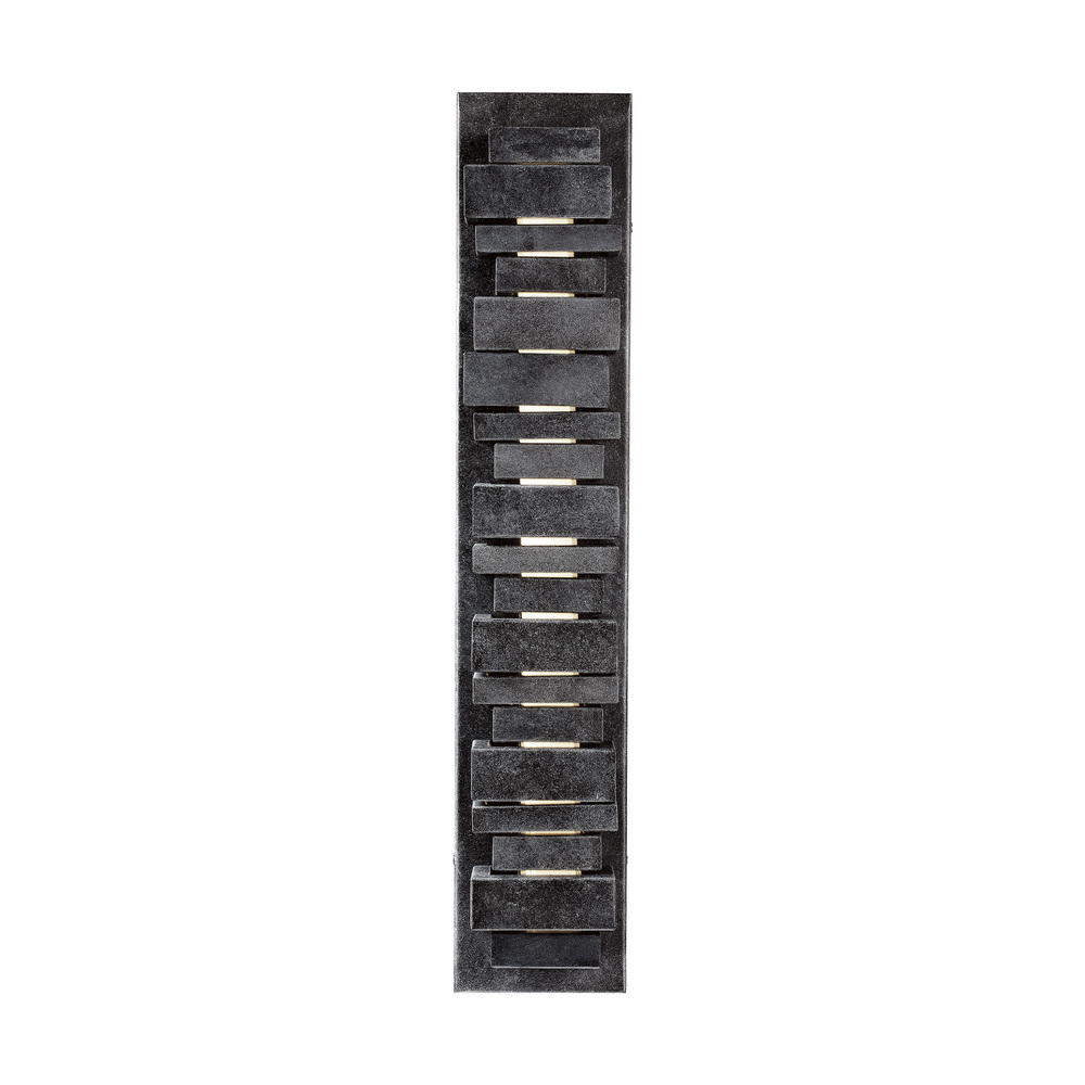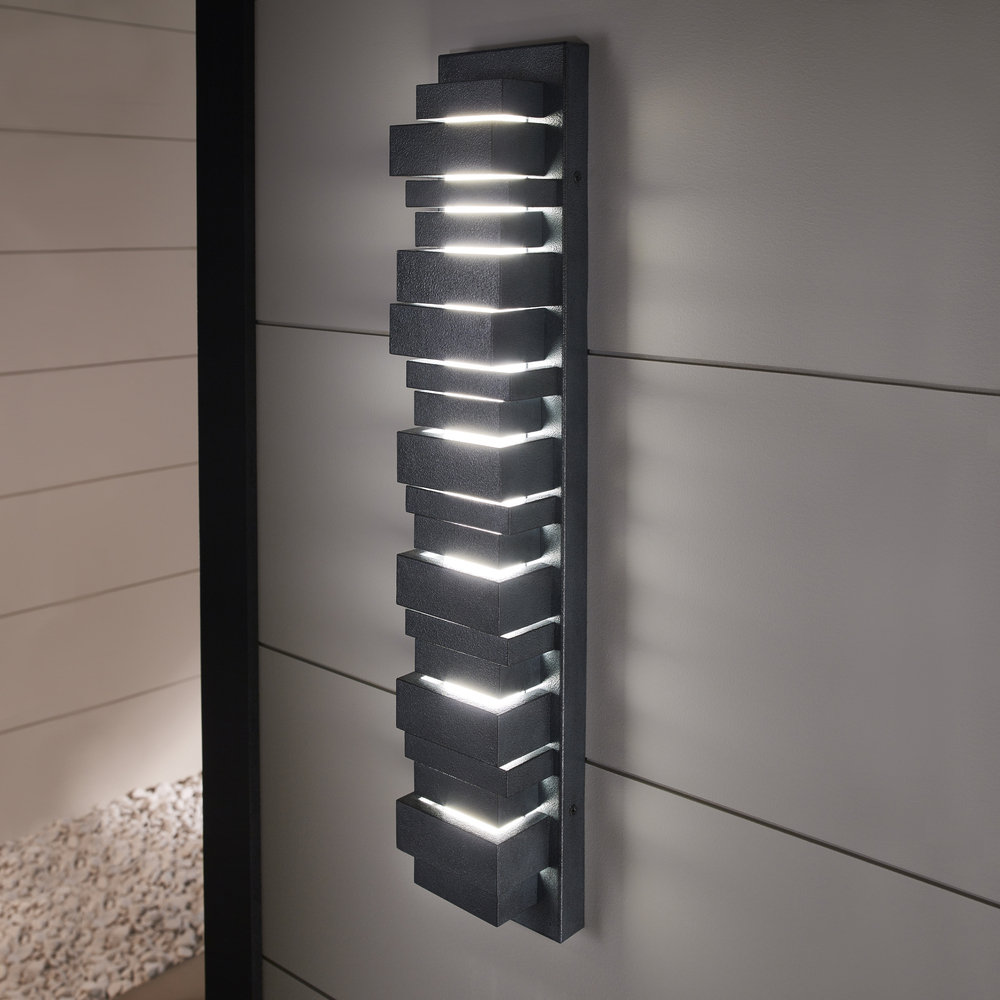 The Ledgend one light outdoor wall fixture in dark weathered zinc enhances the beauty of your property, makes your home safer and more secure, and increases the number of pleasurable hours you spend outdoors. The Ledgend outdoor light wall sconces by are modern and dramatic, making a significant design statement as visitors reach the front door. Energy efficient and long-lasting LEDs direct light forward through off-set openings inspired by stacked flagstone, as well as shining up and down. Made of Cast Aluminum, the fixture has exceptional durability to withstand the harshest elements. With a Dark Weathered Zinc finish, the assortment includes 5", 18" 26and 34" LED outdoor wall sconces.
