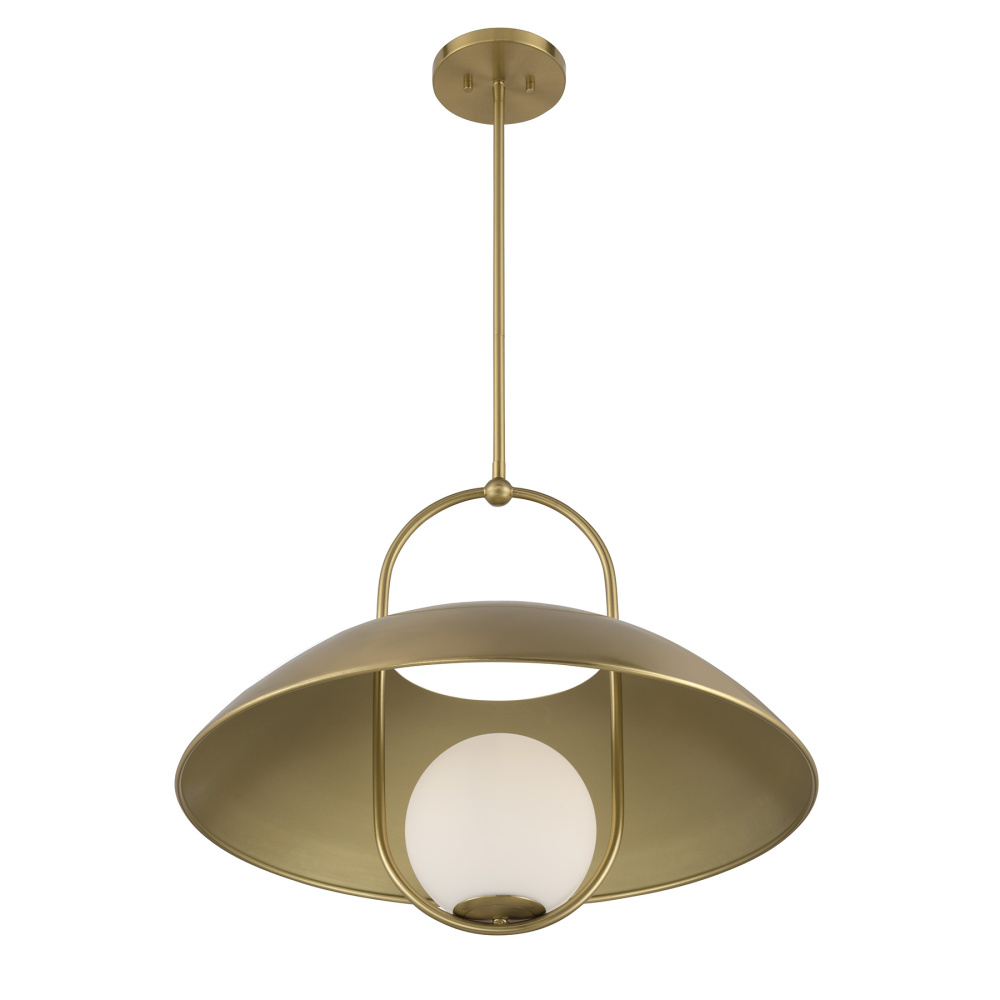 The Savoy House Lehigh 1-light pendant delivers a captivating blend of geometry and glow. An orb of white opal glass rests on a slender oval frame, crowned by a solid shade that focuses light downward while staying open at the top for an airy feel. The Warm Brass finish enriches the silhouette with inviting warmth. Lehigh is 22" in width and has an adjustable height ranging from 18.13" to 72.13". It uses one standard size bulb of up to 60 watts. Bulb not included. Comes with four 12" downrods and one 6" downrod.