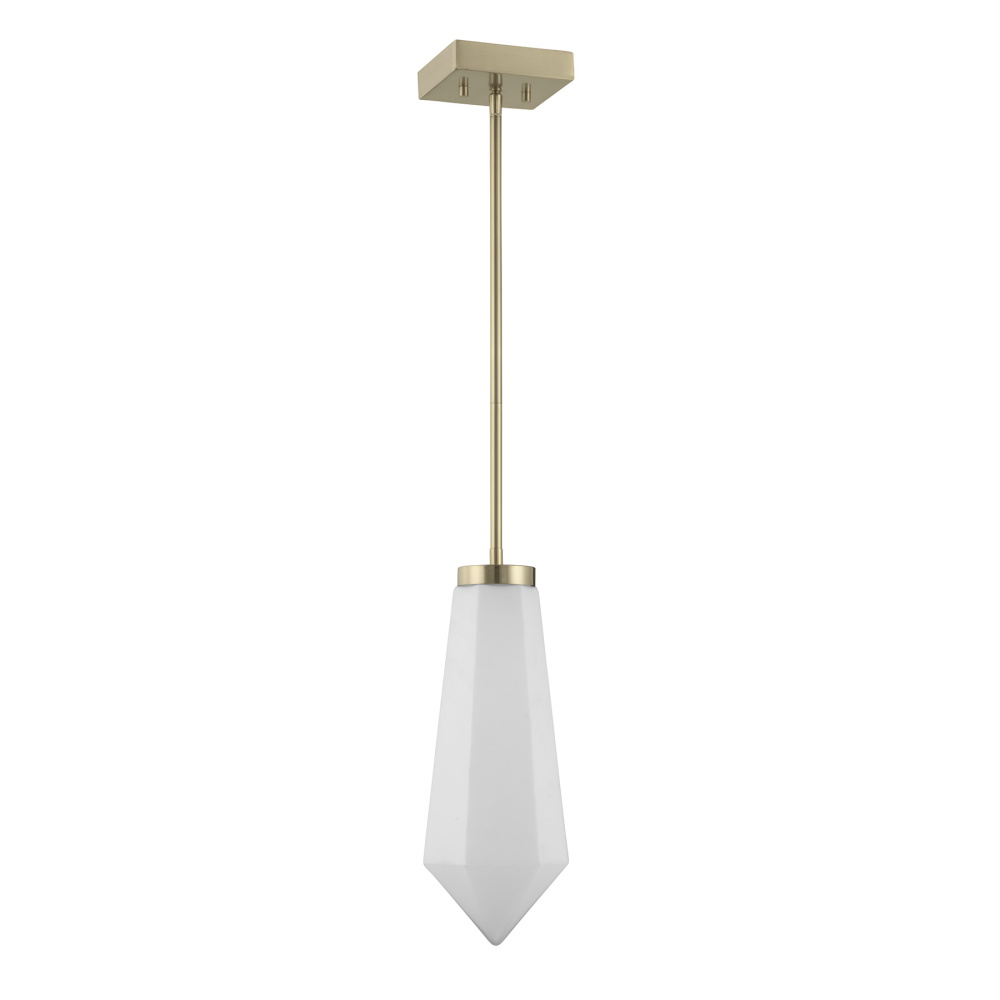 Designed by Dann Foley, the Savoy House Leland 1-light pendant pairs sleek structure with refined materials. A slender frame finished in Noble Brass supports a pointed spear of white opal glass that glows beautifully when lit by the integrated LED light source. Leland is 6" in width and has an adjustable height ranging from 16.25" to 70.25". Comes with four 12" downrods and one 6" downrod.