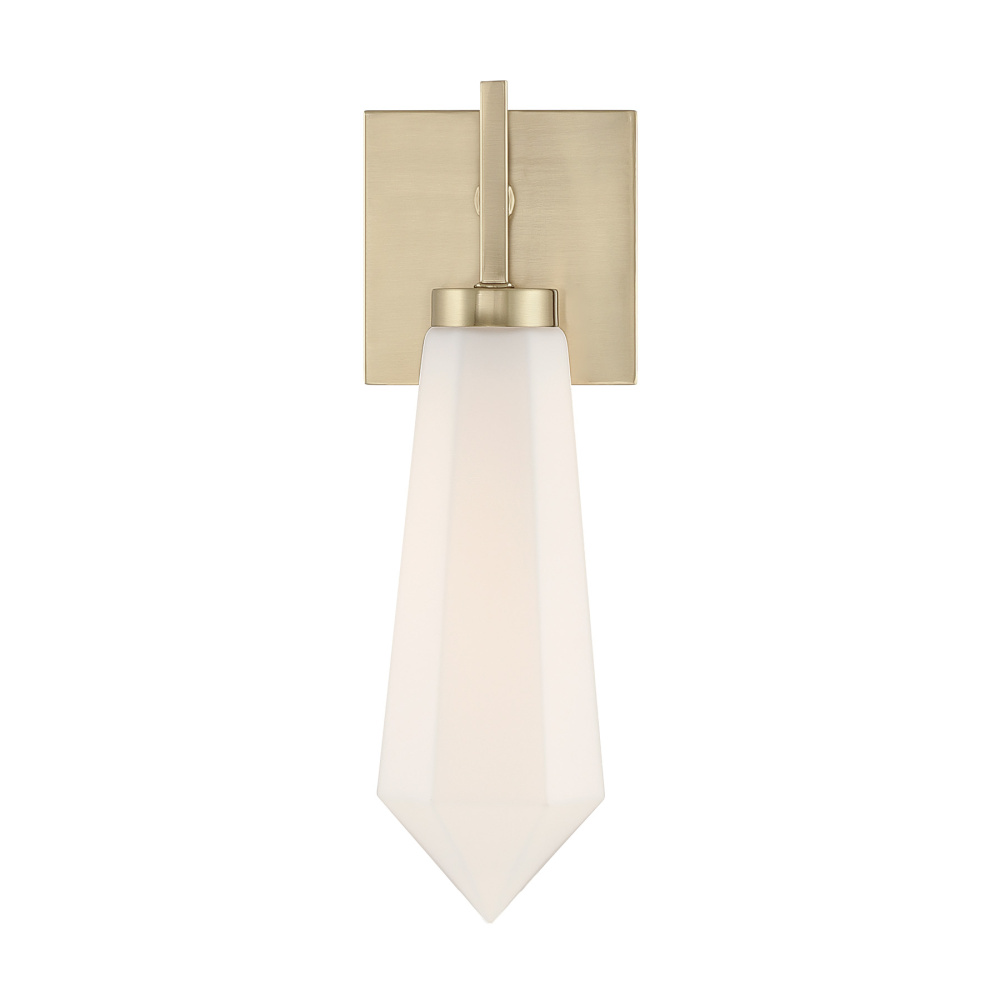 The Savoy House Leland 1-light sconce, designed by award-winning interior designer Dann Foley, brings sculptural sophistication to any space. A slim frame in a Noble Brass finish holds a pointed spear of white opal glass, which gives off an ethereal glow when lit by the integrated LED. Leland is 14" in height, 4.75" in width and extends 5" from the wall. This sconce is damp area rated.