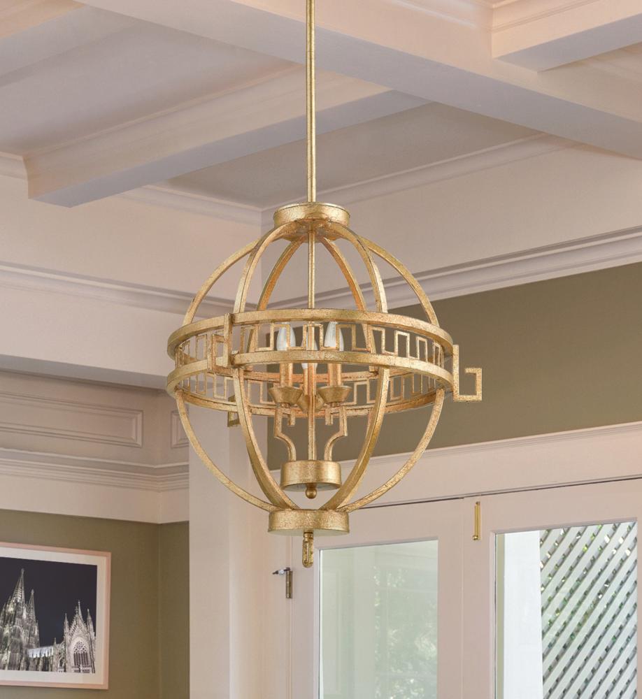 A one-of-a-kind design that is the perfect focal point in our Warm Vintage Gold finish. The Lemuria family designed by Karyl Pierce Paxton uses the classic Greek key motif in a rich Gold Finish and an open chandelier style pendant. The Globe Pendant is a unique traditional orb style, and perfect for customers using in a kitchen or foyer installation. Combining the Rustic Geometric shape and the Traditional Distressed Finish gives a fresh look to our newest Flambeau Inspired piece.