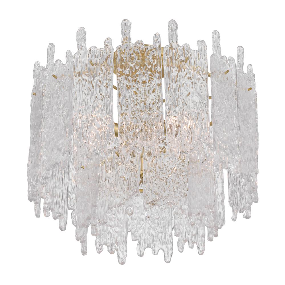 The Ackerly Collection showcases stunning ice glass, a textured material that resembles frozen or cracked ice. Its frosted, crystalline surface uniquely scatters light, producing a soft, diffused glow. This organic, sculptural effect adds a modern yet slightly retro touch to the design. The Ackerly Collection combines elegance with an artistic, edgy aesthetic, making it a standout in any space.