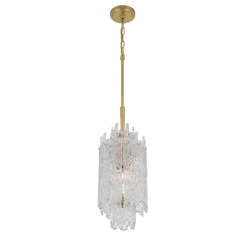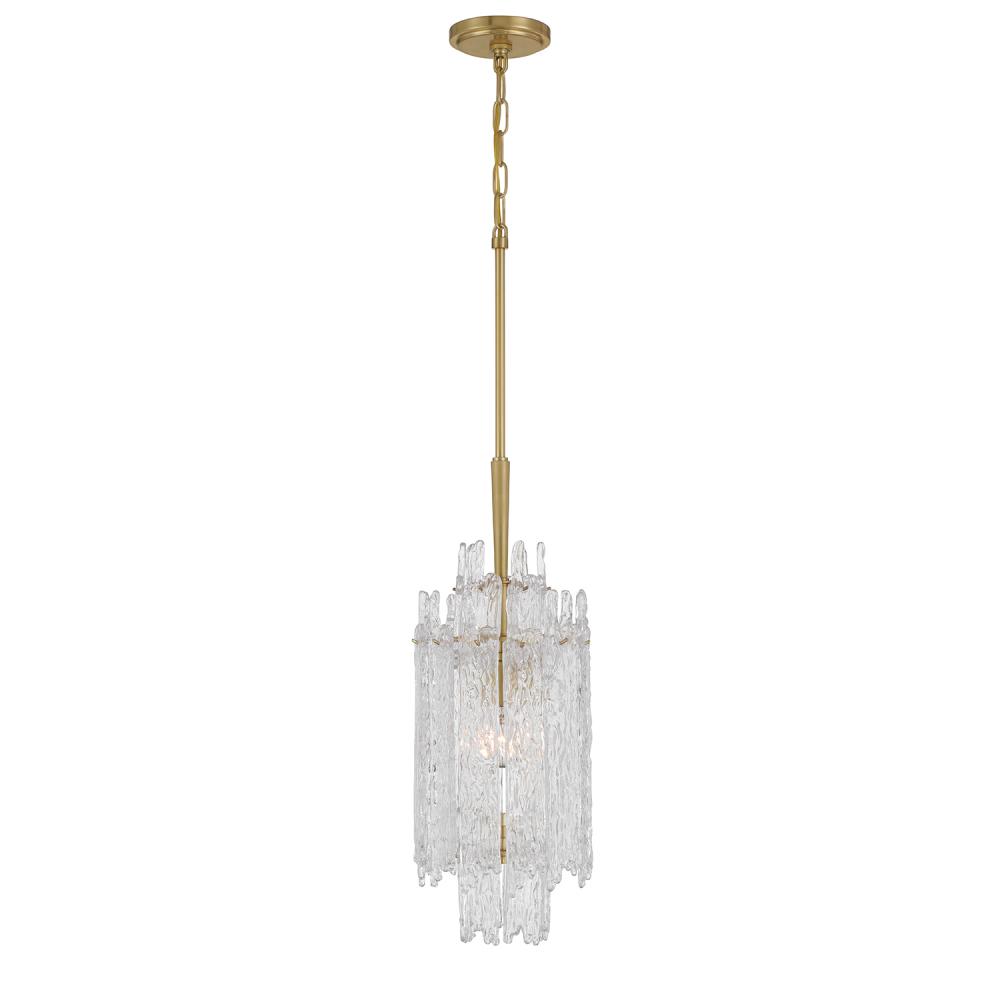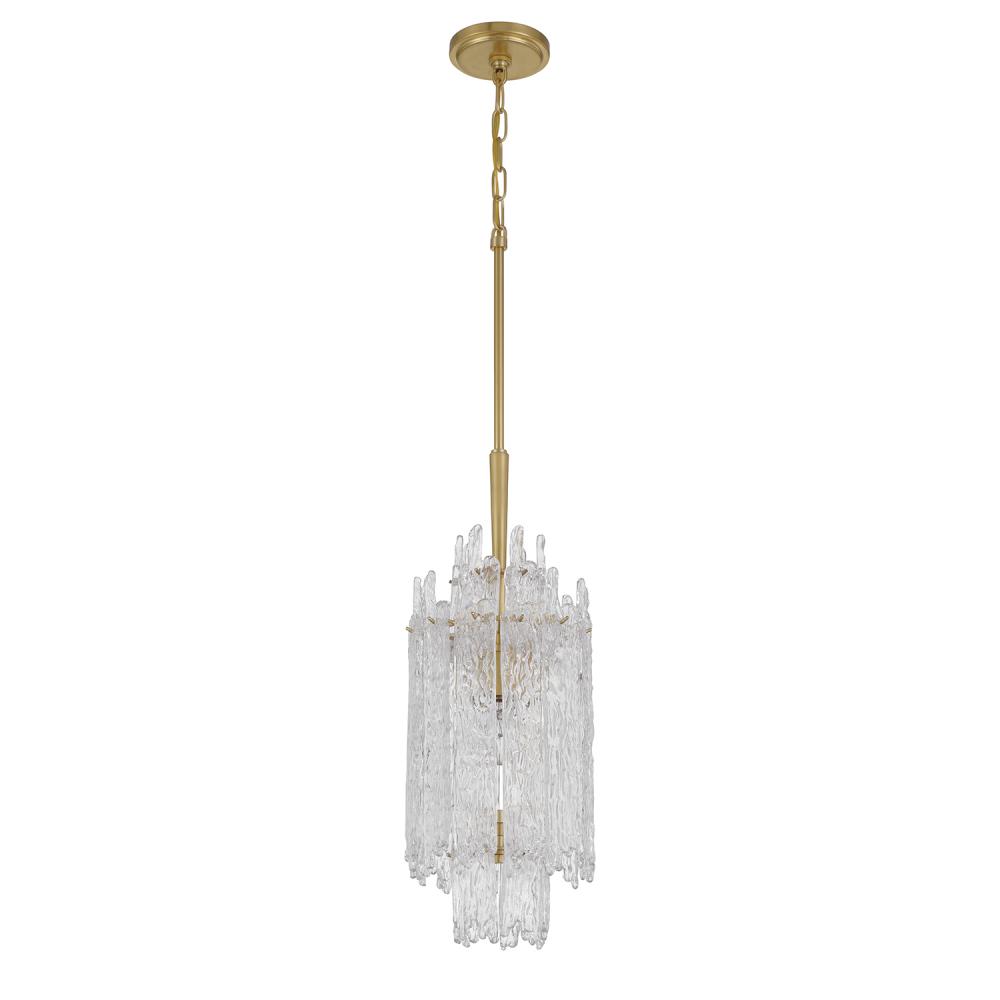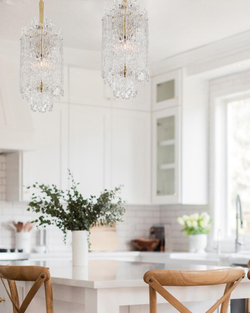 The Ackerly Collection showcases stunning ice glass, a textured material that resembles frozen or cracked ice. Its frosted, crystalline surface uniquely scatters light, producing a soft, diffused glow. This organic, sculptural effect adds a modern yet slightly retro touch to the design. The Ackerly Collection combines elegance with an artistic, edgy aesthetic, making it a standout in any space.