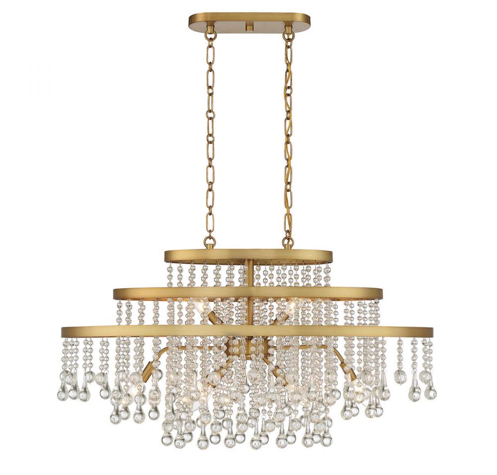 Decorate your space with the Savoy House Luna 10-light linear chandelier, a glamorous look that uses three tiers of lights surrounded by cascading curtains of crystal to create a boldly beautiful look. Lovingly finished in warm brass. Luna is 20" in height, 36" in length and 17" in width. It uses ten candelabra size bulbs of up to 60 watts per bulb. Comes with 120" of chain and 144" of cord.