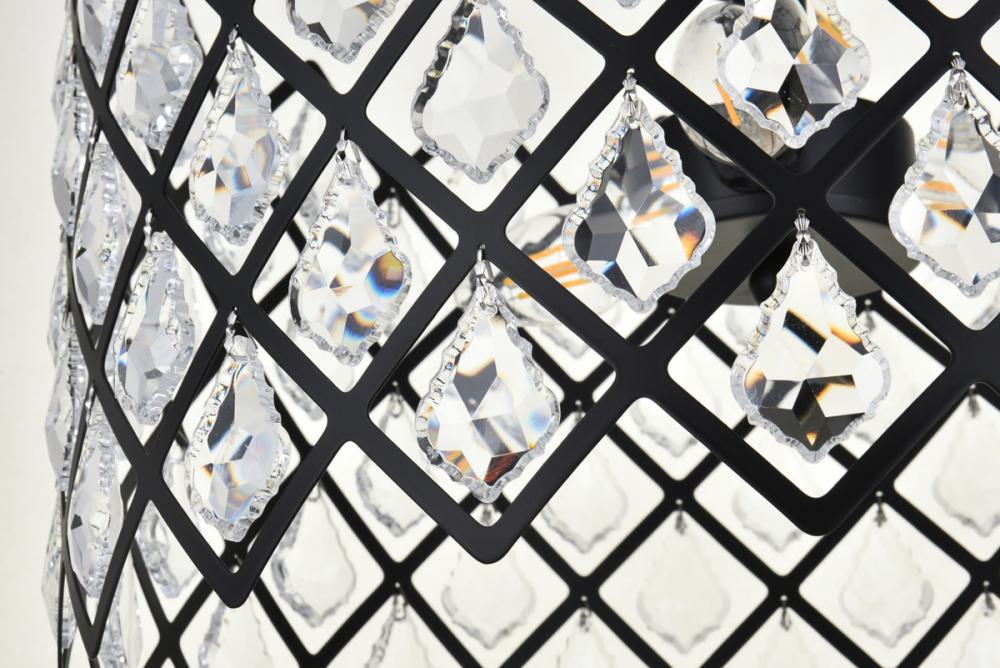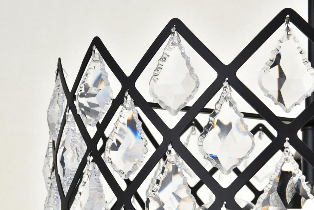 Tiers of clear multi-faceted crystals reflect the soft glow of candelabra bulbs