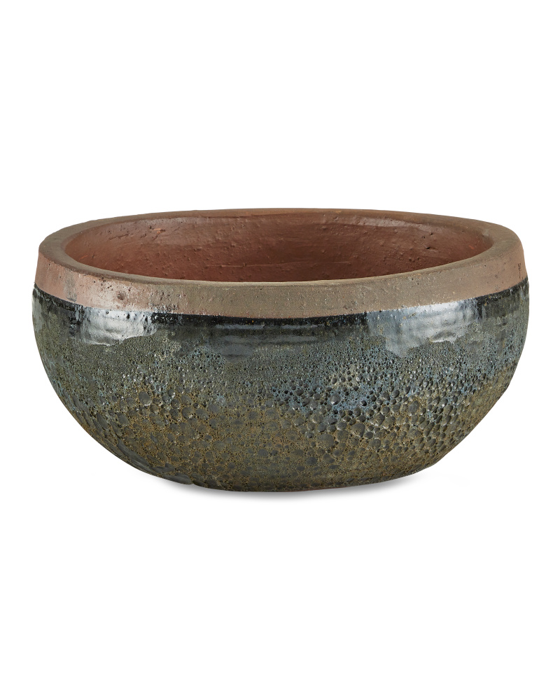 The Lyra Black Small Planter is a bowl-shaped garden planter with a surface that looks like it has fissures and craters in it thanks to the incredible reactive black glazing that was applied after the vessel was fired. Some spots on the surface of the black planter exhibit a hint of sheen while others are matte and mottled. The Lyra has a drain hole, though the vessel does not come with a plug.