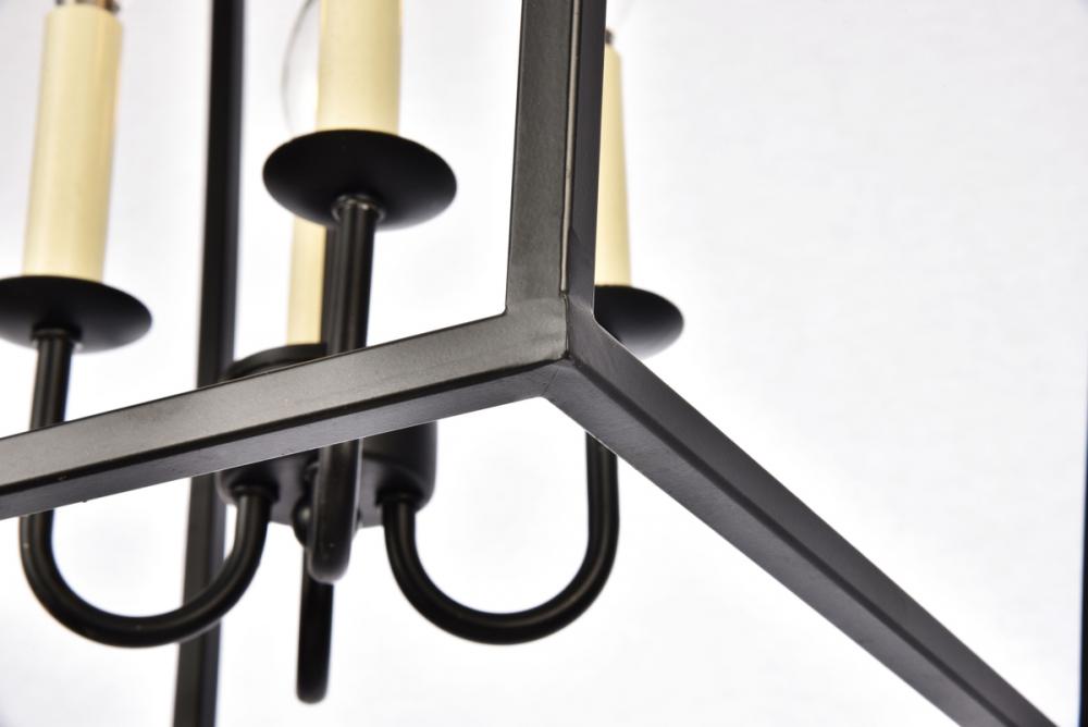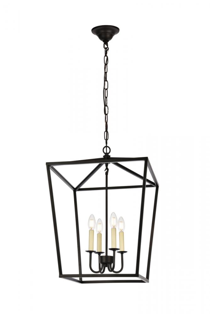 The Maddox collection brings the warmth and charm of the classic “coach light” into your dining room, foyer, or family room. This universally familiar shape features four tapered, inverted trapezoids topped by a clear pyramidal canopy. Four medium-base E26 antique-style filament bulb (Not included) casts light in all directions. The sleek Metal frames and matching hanging chains are available in Black. These cozy pendant lamps complement any home’s décor.