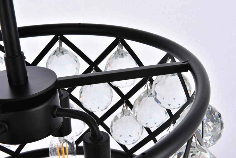 Lamp features a diameter of 16 inches, a height of 9 inches, a minimum hanging length of 15 inches, a maximum hanging length of 69 inches, and requires 4 candelabra bulbs