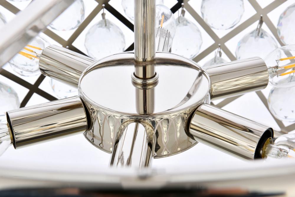 Lamp features a diameter of 20 inches, a height of 13 inches, a minimum hanging length of 19 inches, a maximum hanging length of 73 inches, and requires 6 candelabra bulbs