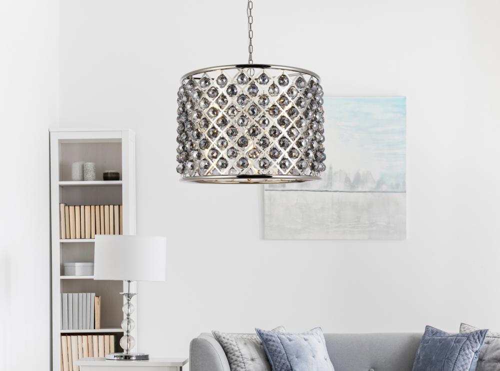 Lamp features a diameter of 27.5 inches, a height of 21 inches, a minimum hanging length of 27 inches, a maximum hanging length of 81 inches, and requires 8 candelabra bulbs