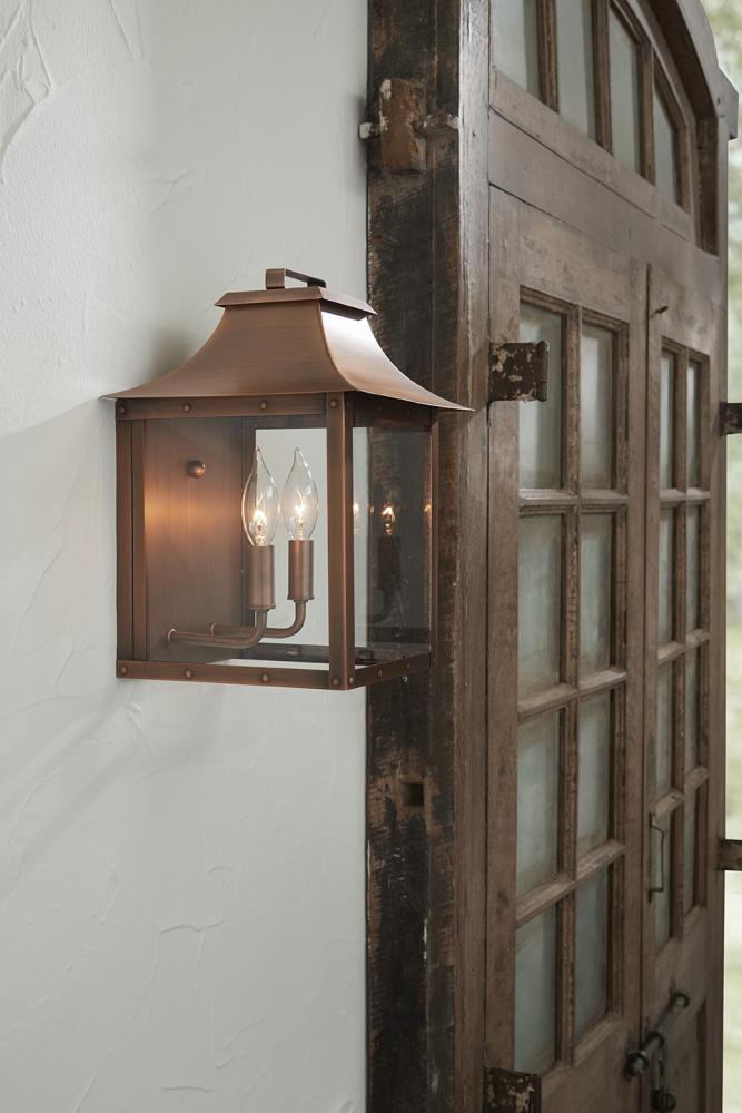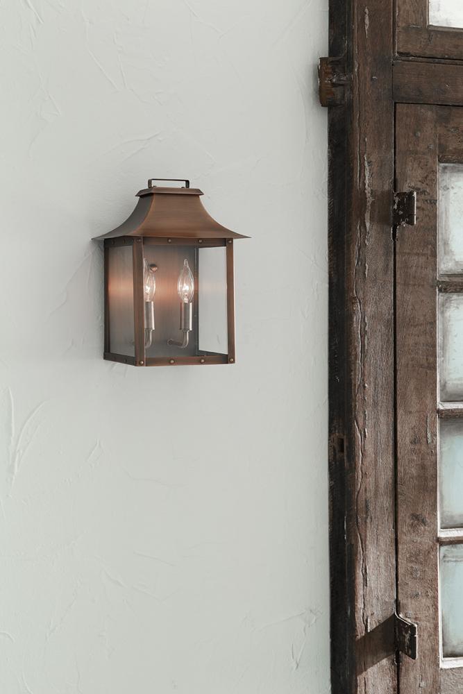 Beautiful copper lanterns in a patina finish. Sturdy rivets and a faux handle adorn the well-made and well-worn traveler's lantern. Clear glass panes complete the antique look of these welcoming wall-lanterns.
