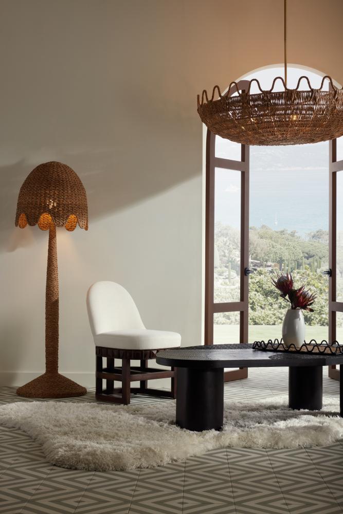 Laura Kirar’s playfully theatrical natural lampakanay woven palm forms – as seen with Mar Floor Lamp and Mar Pendant Chandelier - call to mind the classic era of the 1930’s in the coastal south of France. Kirar pays homage to the details of casually curated Mediterranean interiors with their influences of aged formal furniture, the micro-climate combinations of tropical plants and pines, the passion for all things exotic from carved Spanish vargueño to primitive and sculptural African chairs.