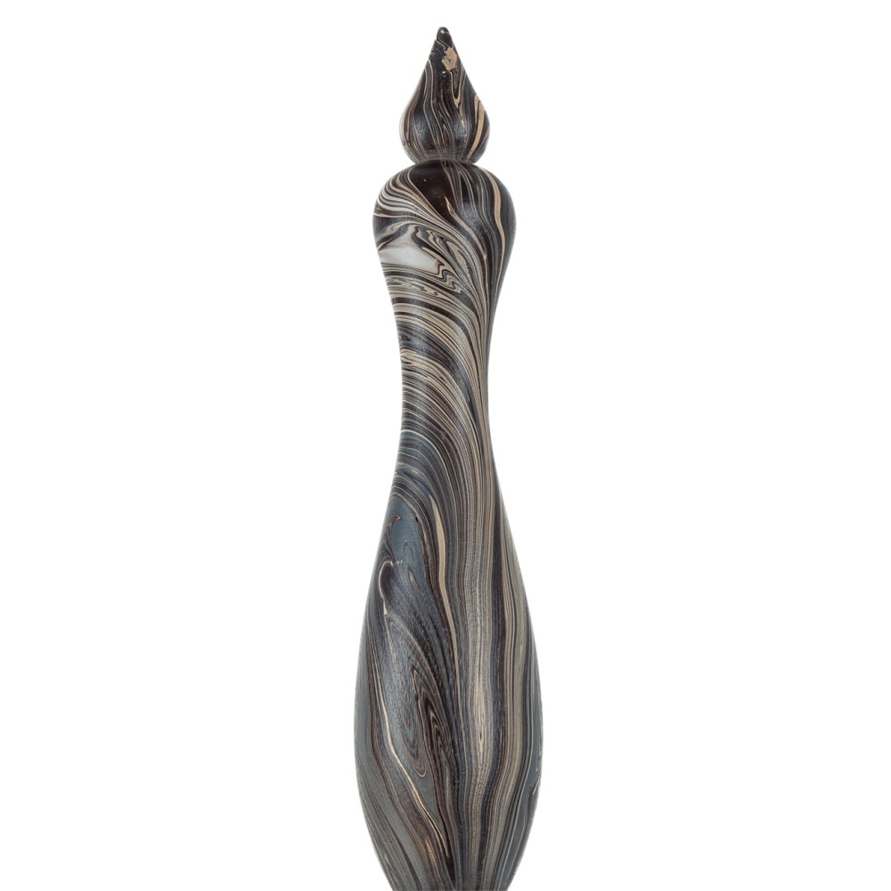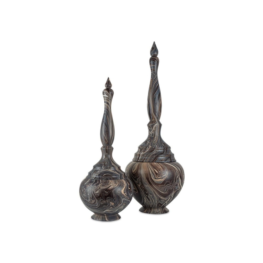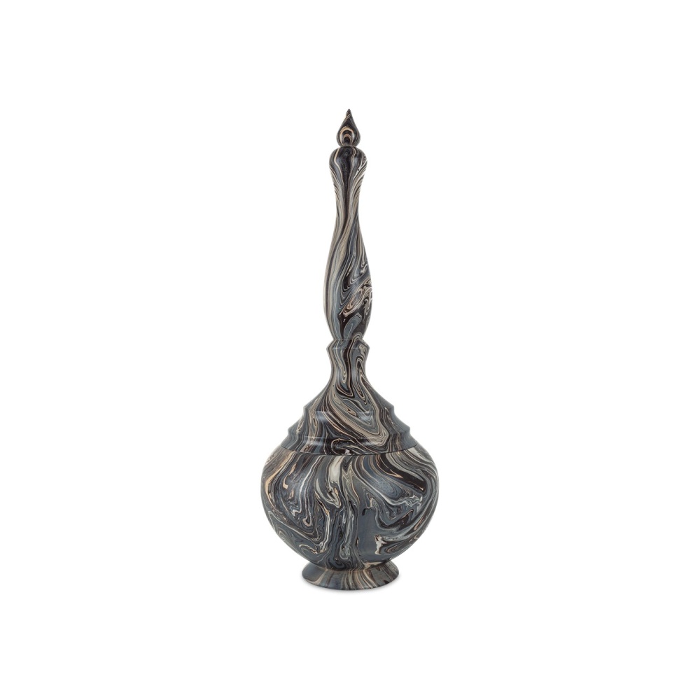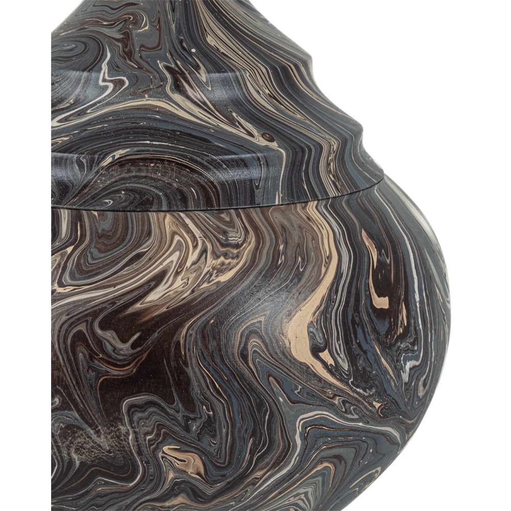The Marbleized Short Turret Box is a commandingly large hand-carved wood sculptural container with a classic antique-inspired form. The surface of the elegant decorative accessory has been treated to a brown marbleized technique that was developed for paper during the 15th century. The sense of movement this brings to the piece makes its rounded form feel kinetic. There will be variations on the exterior of this accessory given it is painted by hand, a beautiful quality of this technique.