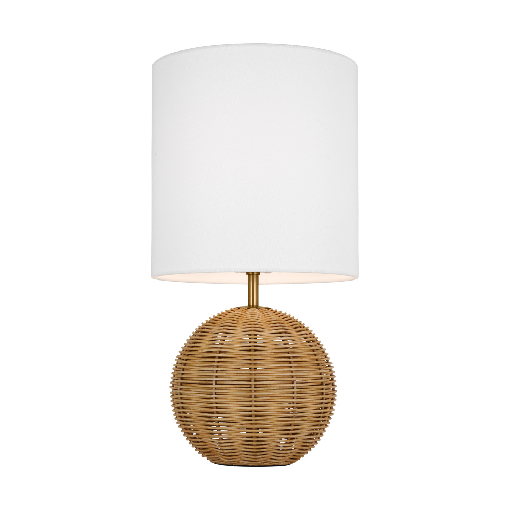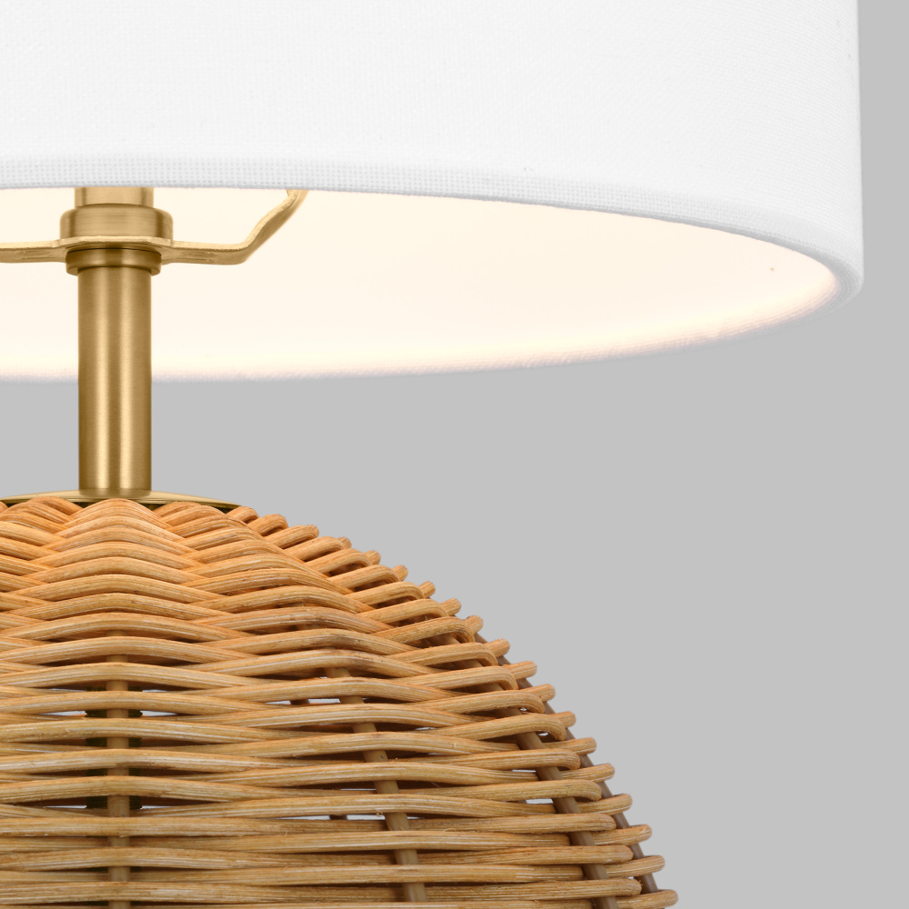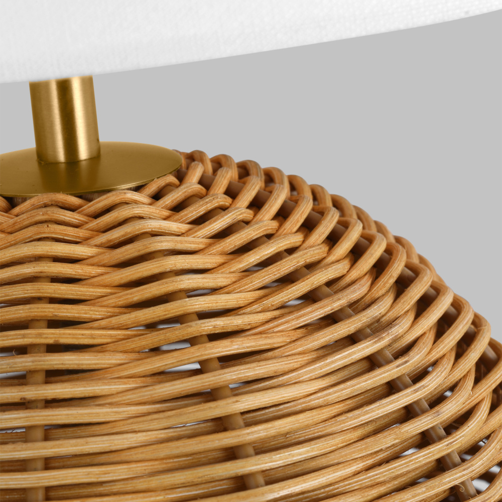 Features a hand-woven rattan base and fabrice white linen shade