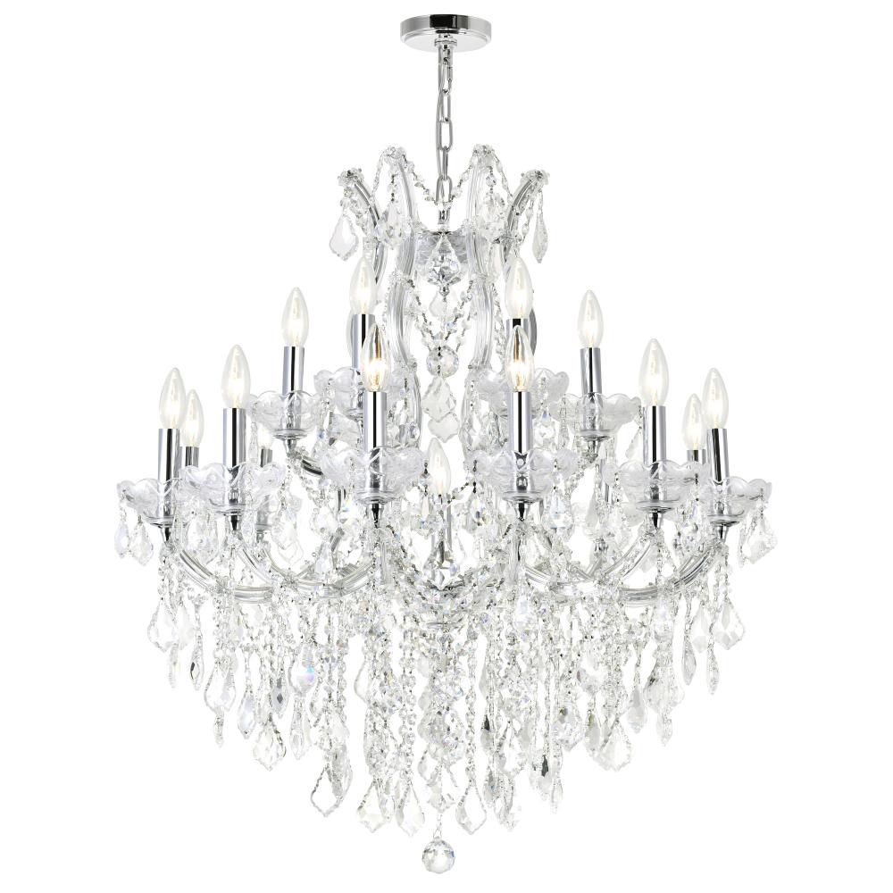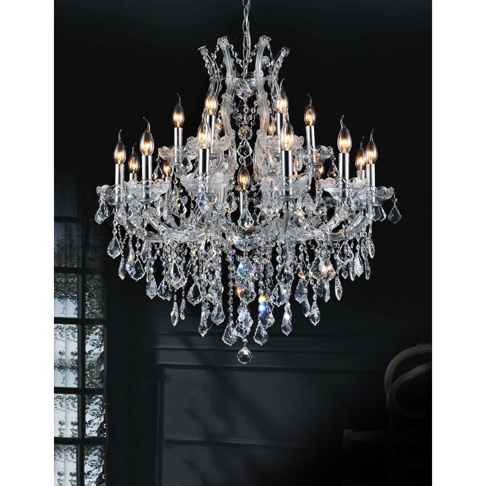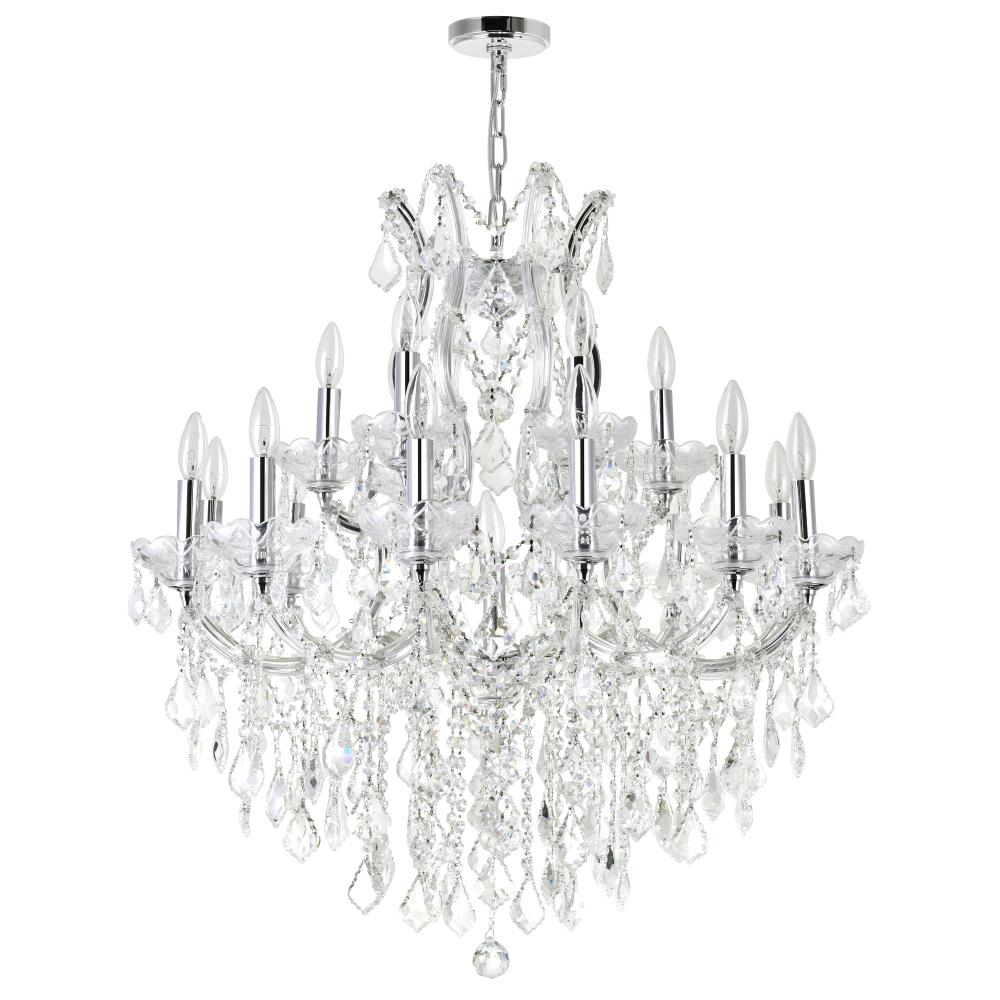 Bring opulent elegance to any room with the stunning Maria Theresa 19-Light Chandelier. Designed to resemble a glamorous candelabra, this exquisite fixture features chrome-finished hardware adorned with cascading crystal strands and dazzling dangling accents. With a 32-inch diameter, this chandelier makes a bold statement in dining rooms, living rooms, or bedrooms, instantly elevating your decor. Perfect for those who love a touch of luxury, it casts a radiant glow that transforms your space into a sophisticated retreat.
