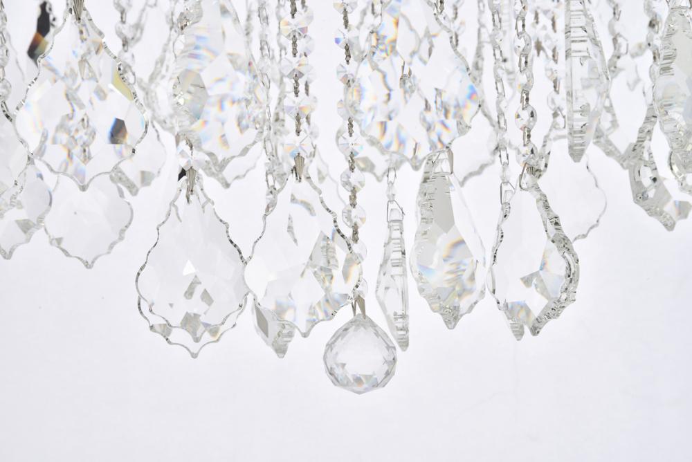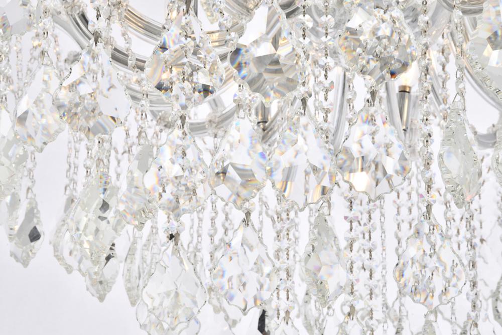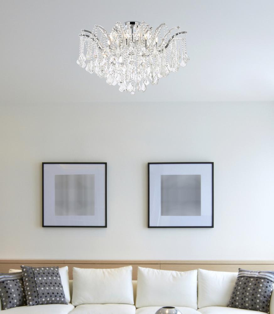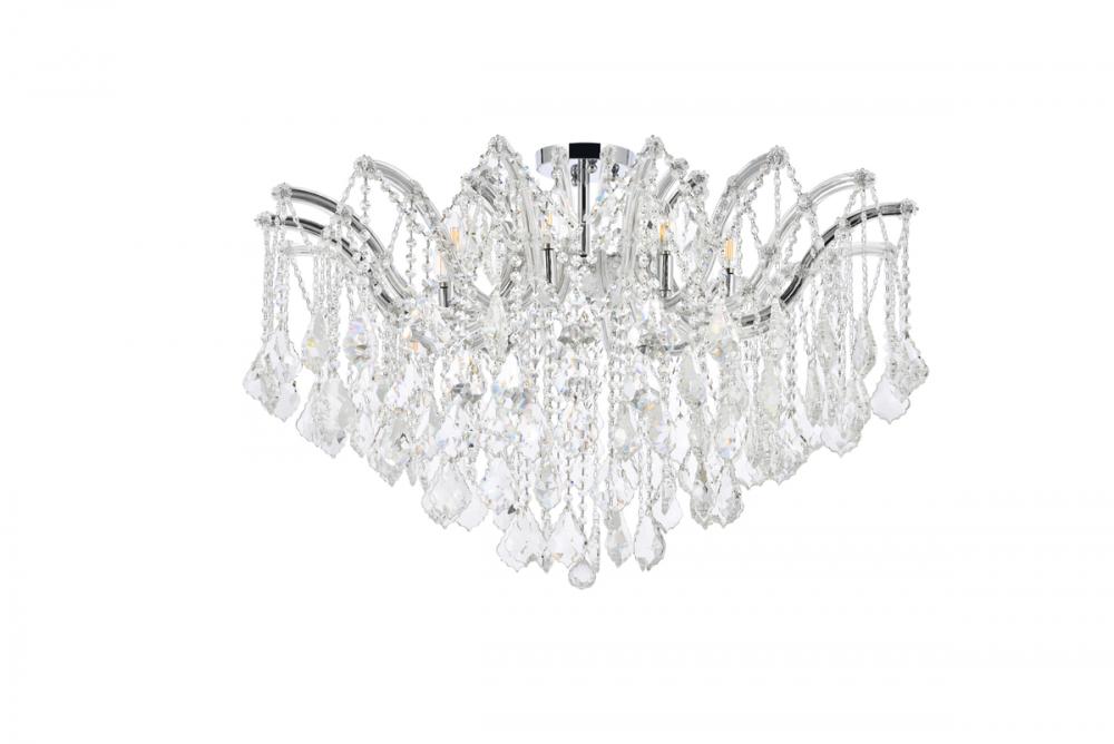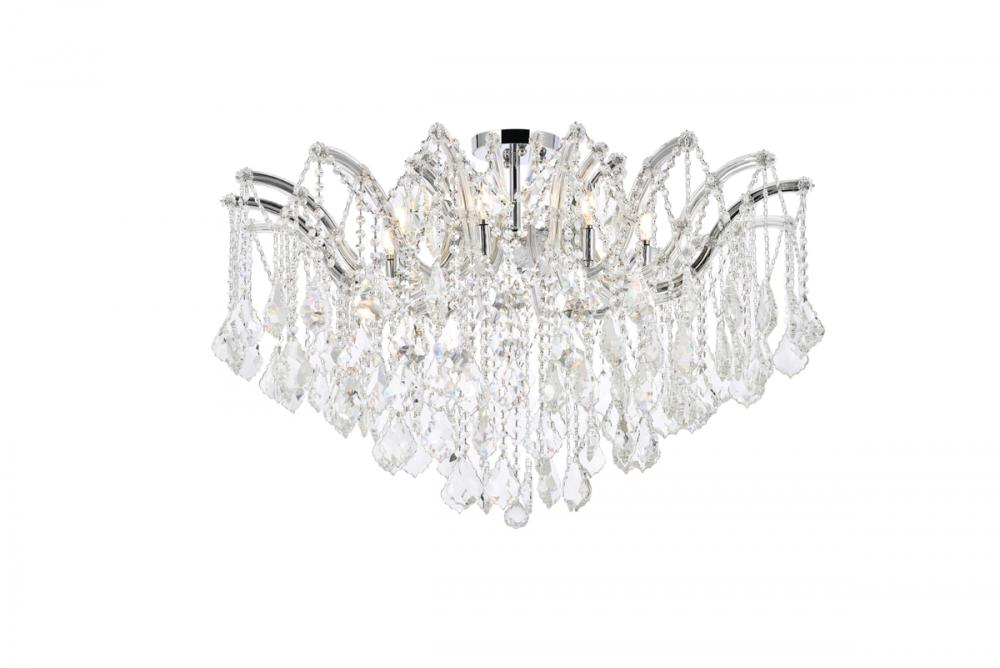 A heavenly high point to your home, Maria Theresa collection flush mount fixtures are ablaze with resplendent crystals. Copious strands of sparkling clear crystals dangle from elaborate tiers of glass-coated steel arms. An imperial favorite for the stairwell, dining room, or living room.