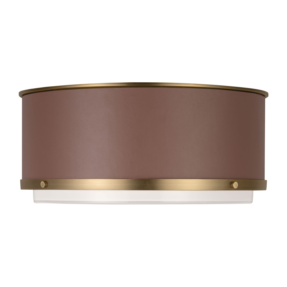 The Marlowe flush mount by Lauren Ralph Lauren embodies timeless sophistication and impeccable craftsmanship. A sleek cylindrical form is elevated by the natural texture and inviting warmth of hand-stitched leather, creating a refined yet approachable design. Accented with sturdy metal trim, the fixture exudes a subtle shine that beautifully complements its rugged yet elegant aesthetic. The glass bottom ensures ample illumination, while functional screws add a distinctively industrial-inspired decorative detail.