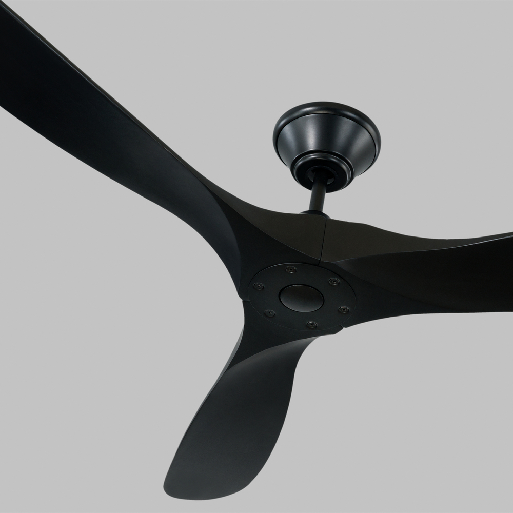 The Maverick 60 in Matte Black w Matte Black Blades features an 85.0 X 28.0 6-speed motor with a Thirteen-degree blade pitch. With a sleek modern silhouette, a DC motor, and super energy-efficiency, the 60" Maverick ceiling fan features softly rounded blades and elegantly simple housing. Maverick has a 60-inch blade sweep and a 3-blade design that delivers a distinct profile and incredible airflow for living rooms, great rooms, or outdoor covered areas. It includes a hand-held remote with six speeds. It reverses and is available in six distinct finish options: Brushed Steel housing with Dark Walnut blades, Brushed Steel housing with Koa blades, Matte Black housing with Dark Walnut Blades, Aged Pewter housing with Light Grey Weathered Oak blades, Matte Black housing with Matte Black blades and Matte White housing with Matte White blades. All versions feature beautiful hand-carved balsa wood blades. ENERGY STAR qualified. Maverick fans are damp-rated and may be used indoors and in covered outdoor spaces.