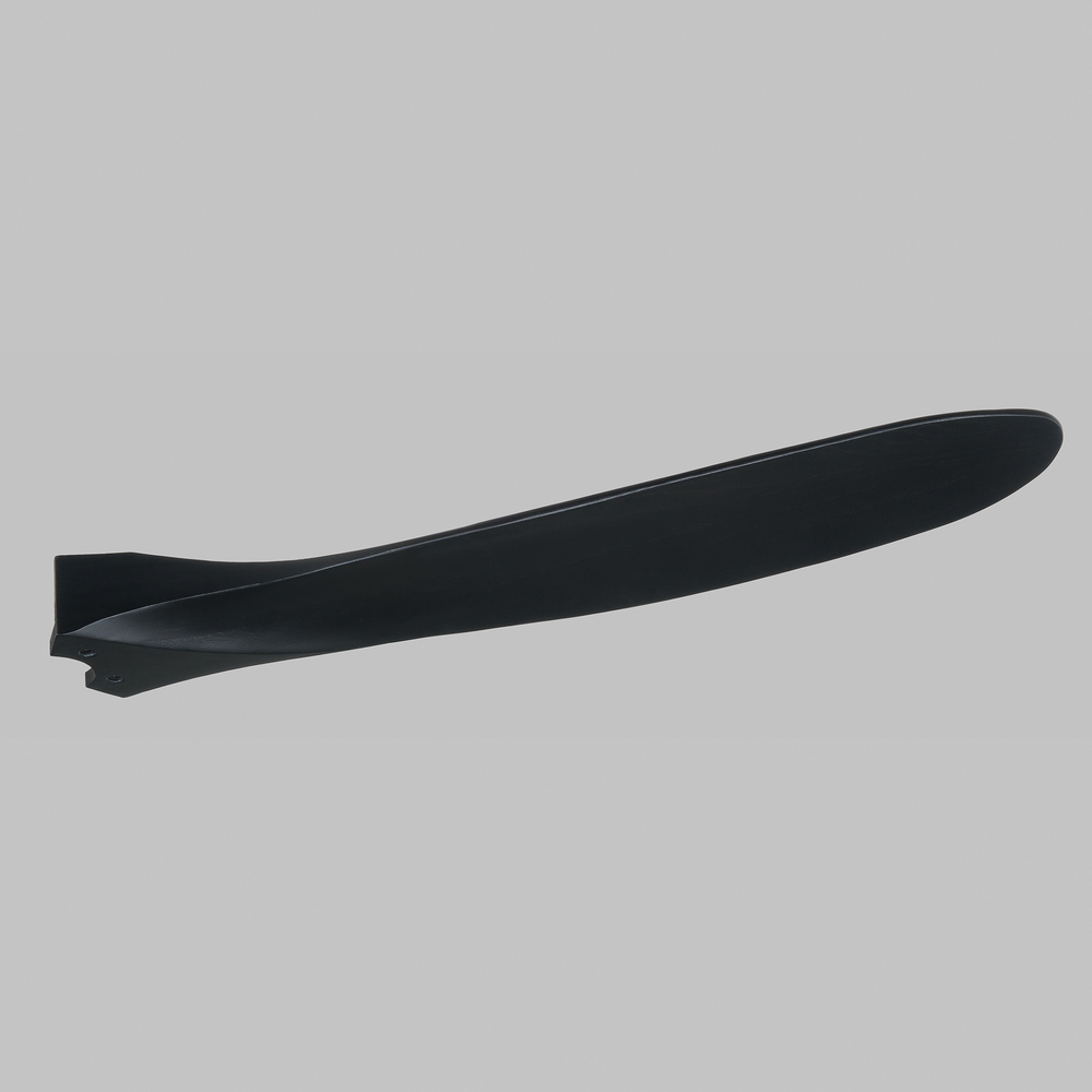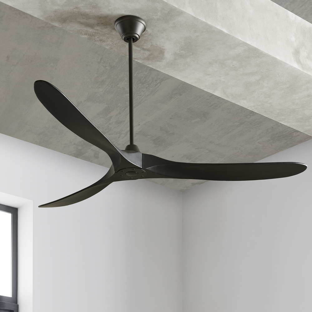 The Maverick 70 in Matte Black w Matte Black Blades features a 85.0 X 28.0 6 speed motor with a Thirteen degree blade pitch. With a sleek modern silhouette, a DC motor and super energy-efficiency, the 70" Maverick Max ceiling fan from features softly rounded blades and elegantly simple housing. Maverick Max features a 3-blade design that delivers a distinct profile and incredible airflow for living rooms, great rooms or outdoor covered areas. It includes a hand-held remote with six speeds and reverse, and is available in six distinct finish options: Brushed Steel housing with Dark Walnut blades, Brushed Steel housing with Koa blades, Matte Black housing with Dark Walnut Blades, Aged Pewter housing with Light Grey Weathered Oak blades, Matte Black housing with Matte Black blades and Matte White housing with Matte White blades. All versions feature beautiful hand-carved, balsa wood blades. ENERGY STAR qualified. Maverick fans are damp-rated, and may be used indoors or in covered areas.
