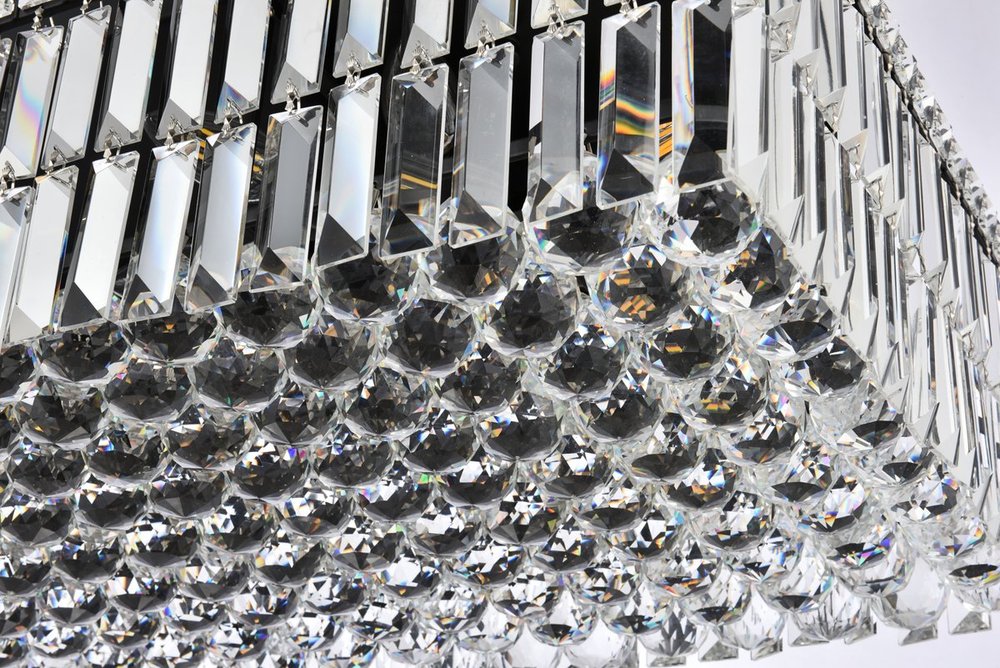 A riot of shapes and textures, Maxime collection flush mounts sparkle in a mosaic of crystal tiles. Square and rectangular precision-cut crystals form the flamboyant exterior while faceted crystal balls create a bubbled effect for light to shine through beneath. Available in a black or chrome finish with clear crystals, these lamps are a luxurious addition to a kitchen, stairwell, foyer, or living room.