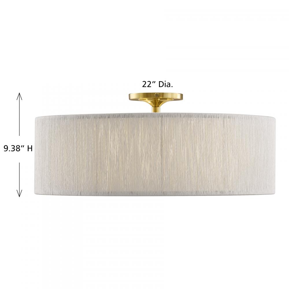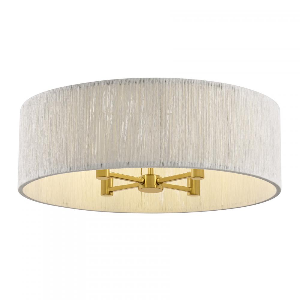 The Savoy House Maynard 4-light flush mount boosts the style and illumination of any space. Its shade is intricately woven with soft white rope, infusing your room with relaxed organic style. The Warm Brass finish adds a hint of glamour. Maynard is 9.38" in height and 22" in width. It uses four candelabra size bulbs of up to 60 watts per bulb. Bulbs not included.