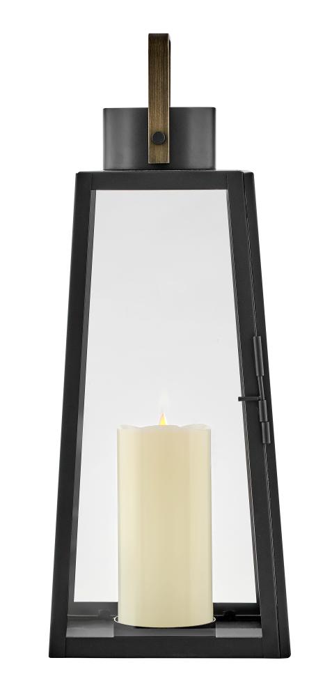 Hype up your alfresco area with the Hugh Decorative Lantern and its sleek, transitional style. The trapezoidal design features bold, over-scaled clear glass panes paired with a bold metal frame to inject a modern edge. With this decorative lantern, you can take the light where you need it, whether that's on a porch, a screened-in patio, or next to an inside fireplace. With an LED faux flame wick candle included, it's easy to make Hugh pop inside or out, with no electrical wiring required.