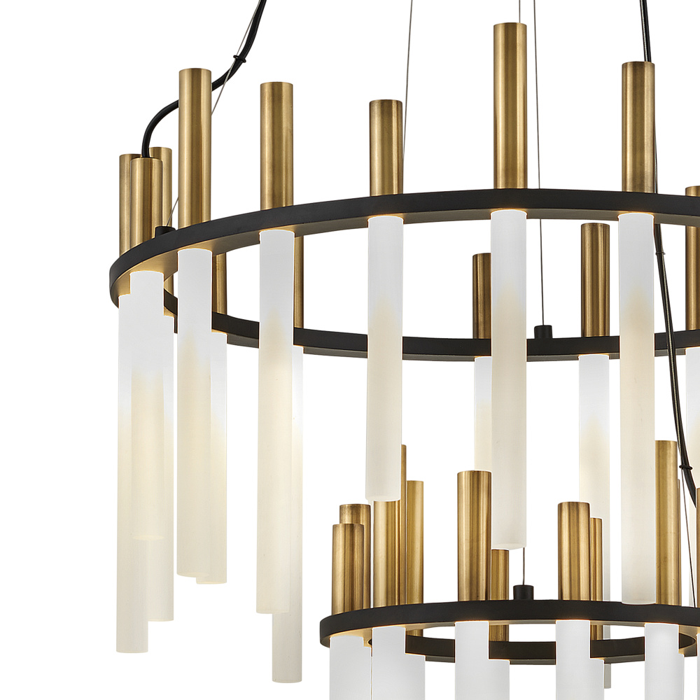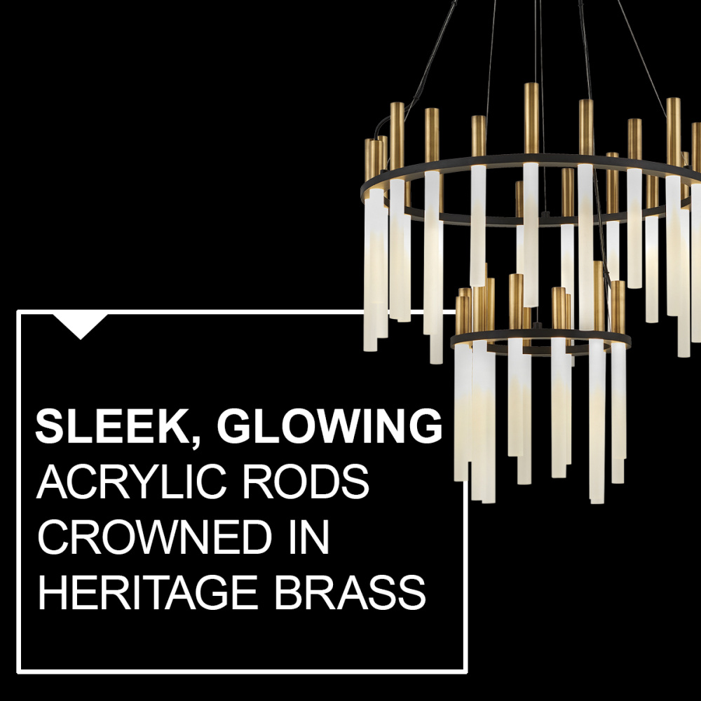 Echo’s spectacular, integrated LED design reverberates with modern style. Sleek, glowing acrylic rods are crowned in metal tubes giving a contemporary look. Echo is offered in Heritage Brass finish accented by bold Black.