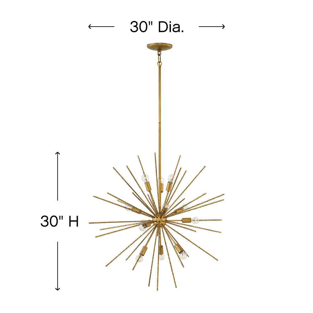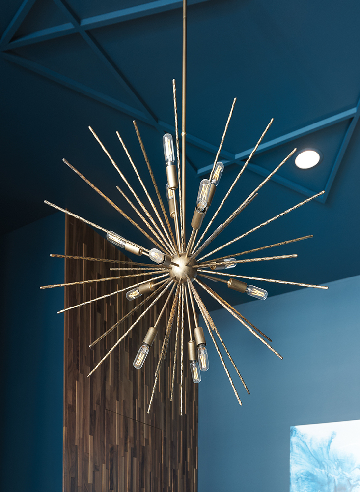 A seamless blend of vintage sophistication and contemporary clout, Tryst offers a striking mix of design elements. Hammered stems radiating from a spherical body shimmer as the light dances across the facets, creating a robust yet airy effect.