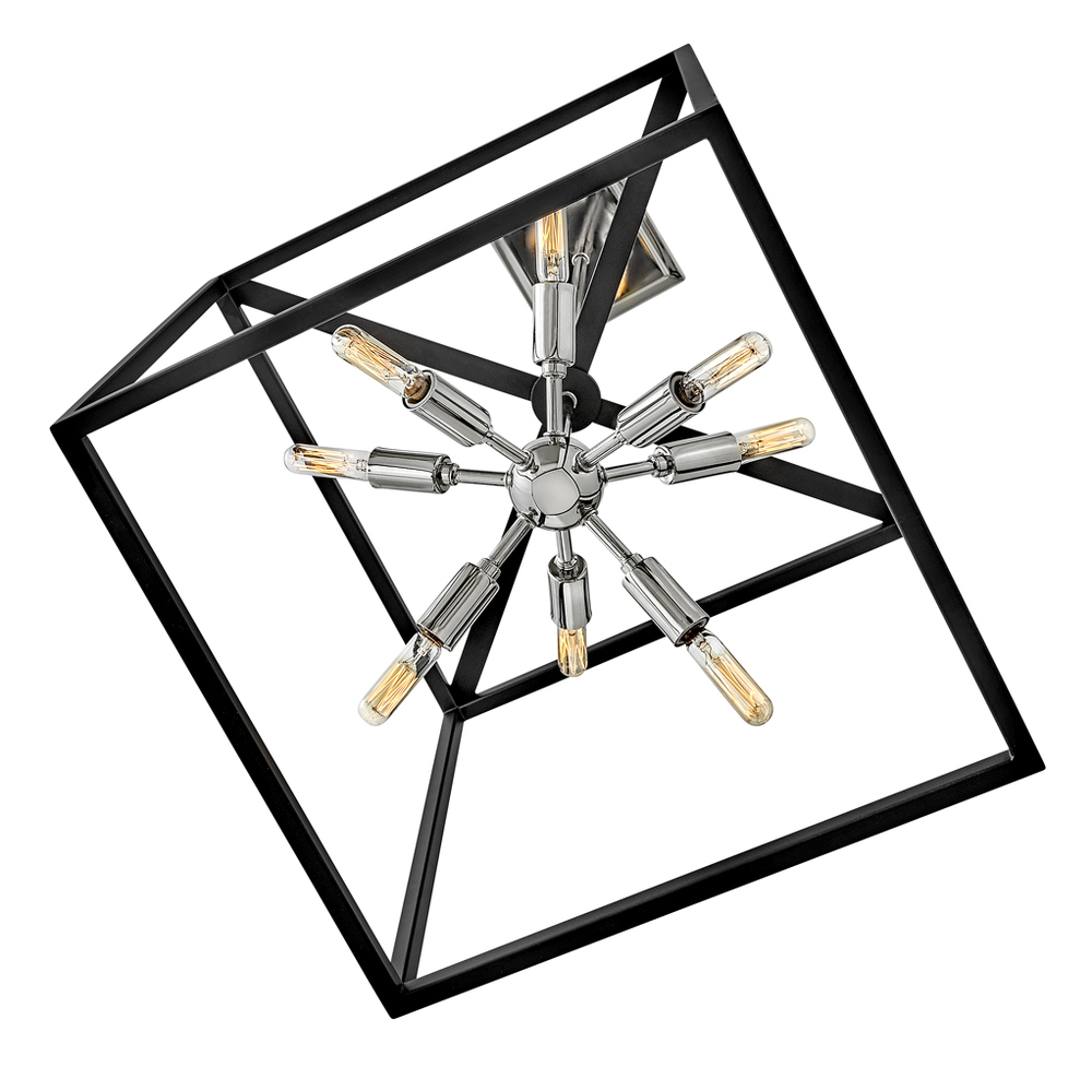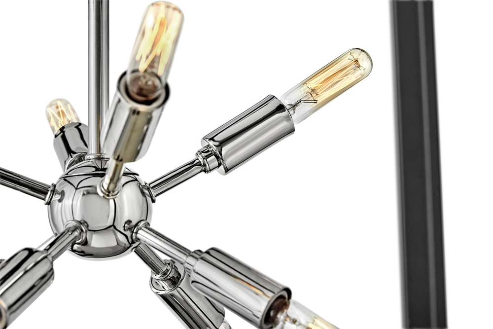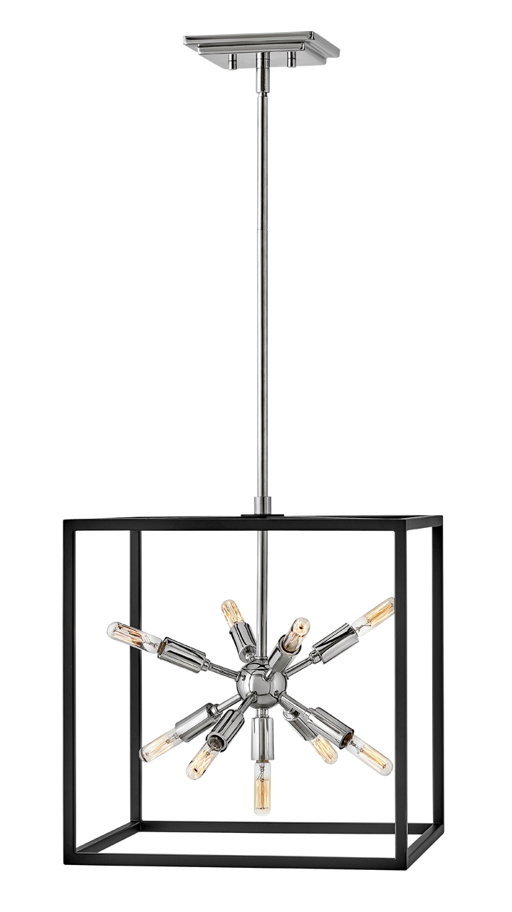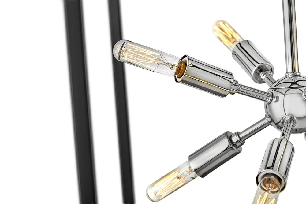 The striking Aros pendant showcases a provocative mid-century modern starburst cluster in a luxurious Warm Brass or Polished Nickel framed by an articulating, angular cage in prominent Black. For added drama, the sophisticated pendants dazzle with dimension to fill unique spaces or higher ceilings. Aros is part of the Lisa McDennon Collection.