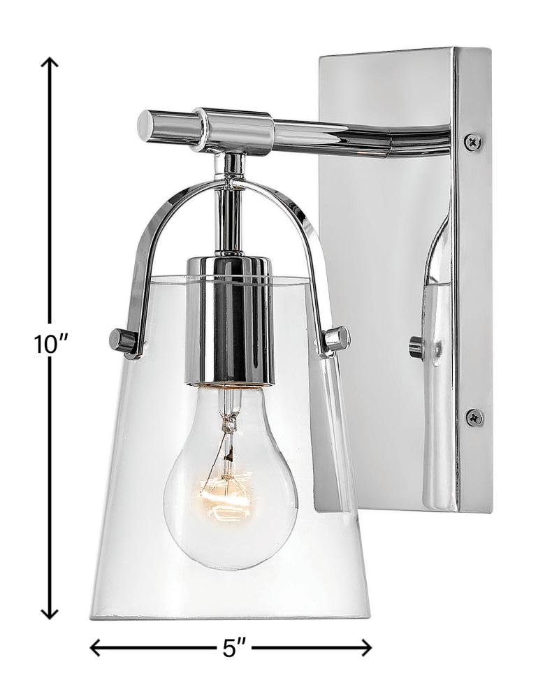 Clean and airy, Foster breathes composed simplicity into any bath space. Its softly tapered glass shade, suspended from arched handle prongs, creates a sophisticated transitional silhouette, enhanced by practical yet stylized details.