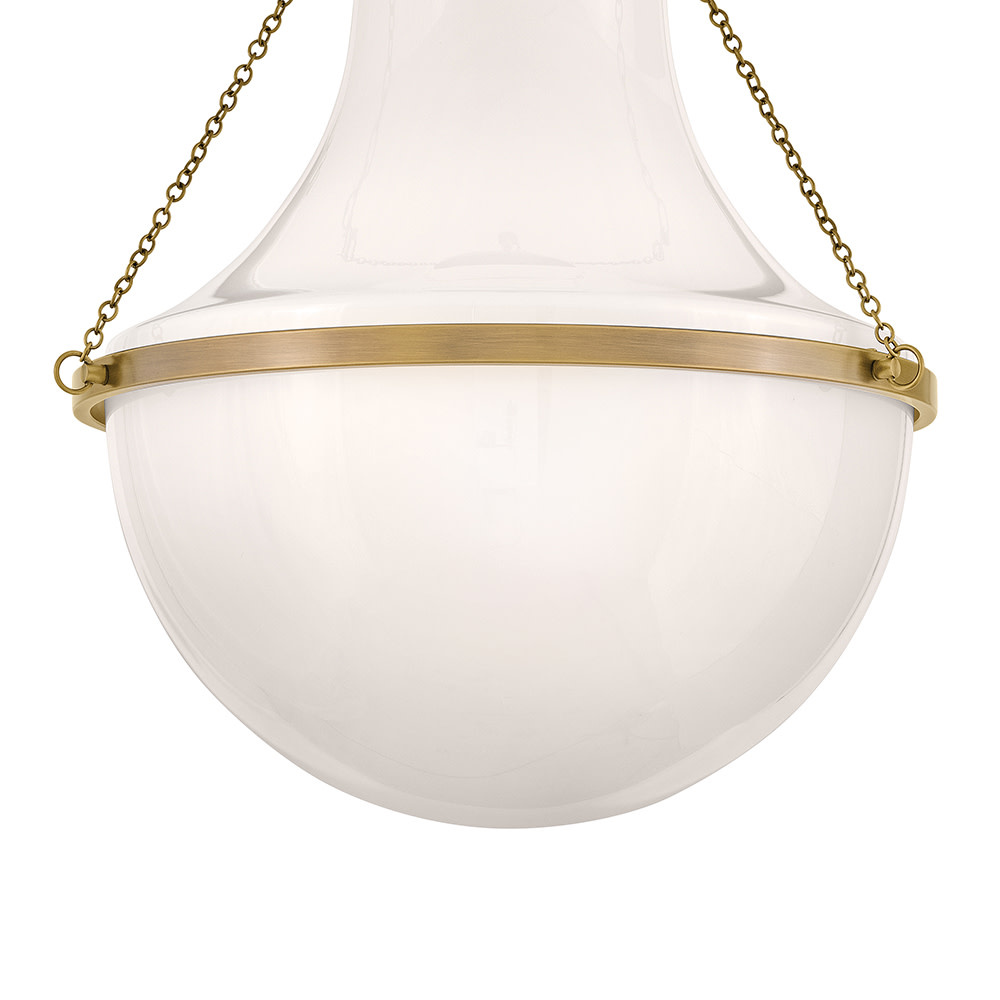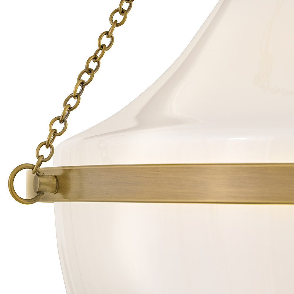 Fusing a sculpted, modern form with classically styled details, Collins features a transitional teardrop shade crafted from blown, cased opal glass. A central metal band and delicate chain uprights are available in Heritage Brass or Black Oxide finishes.