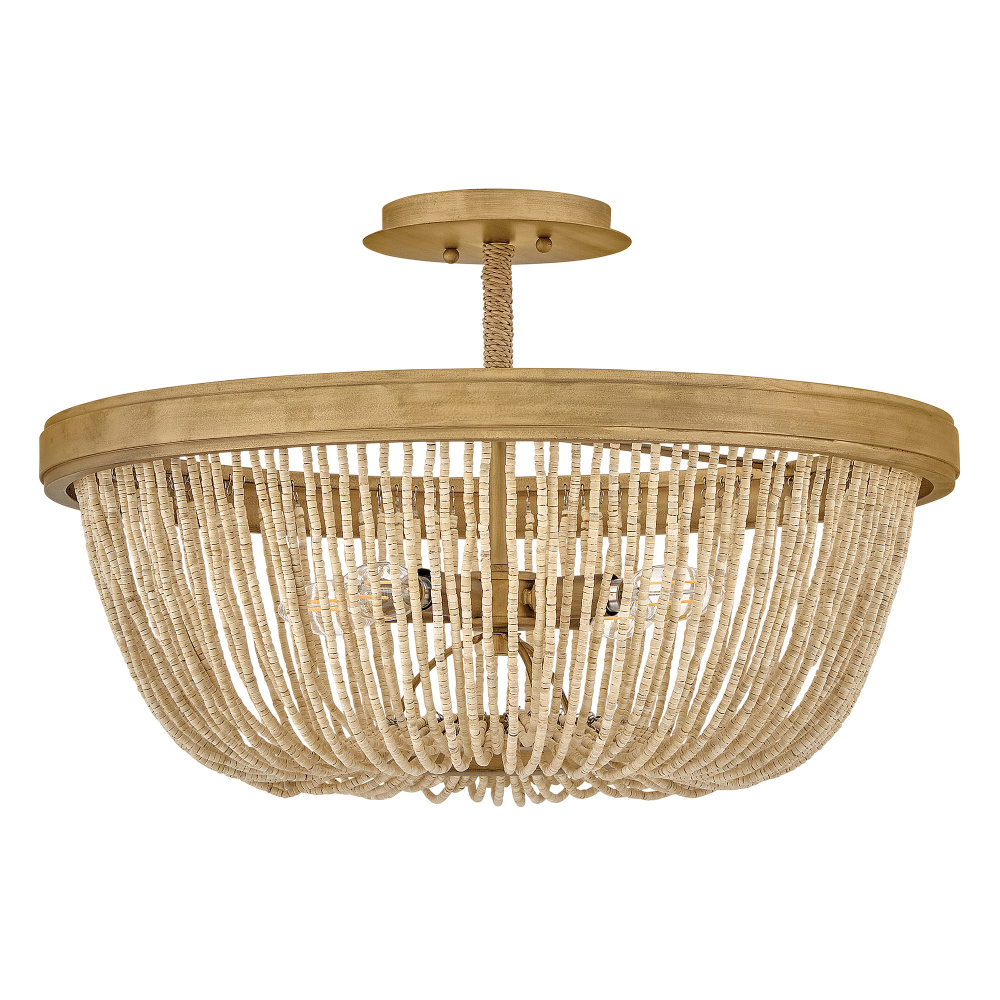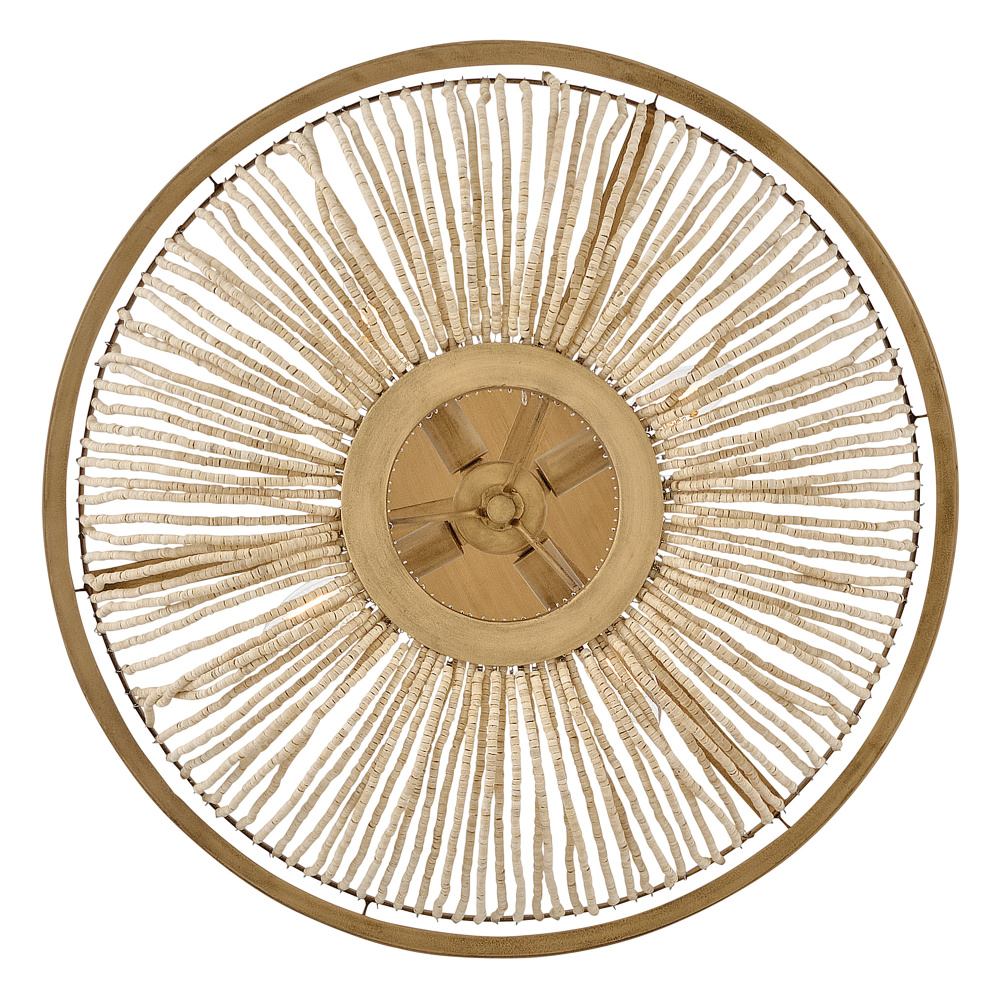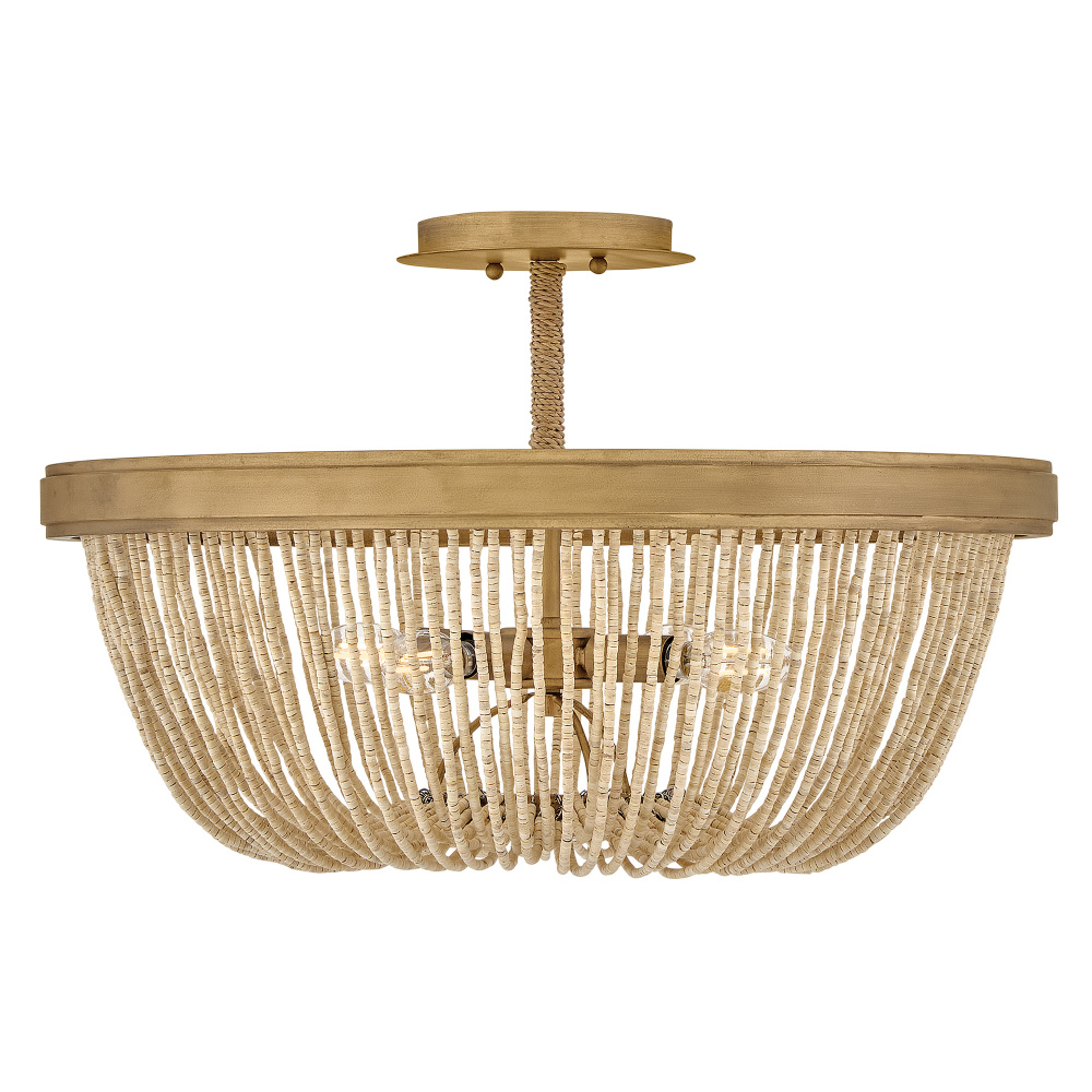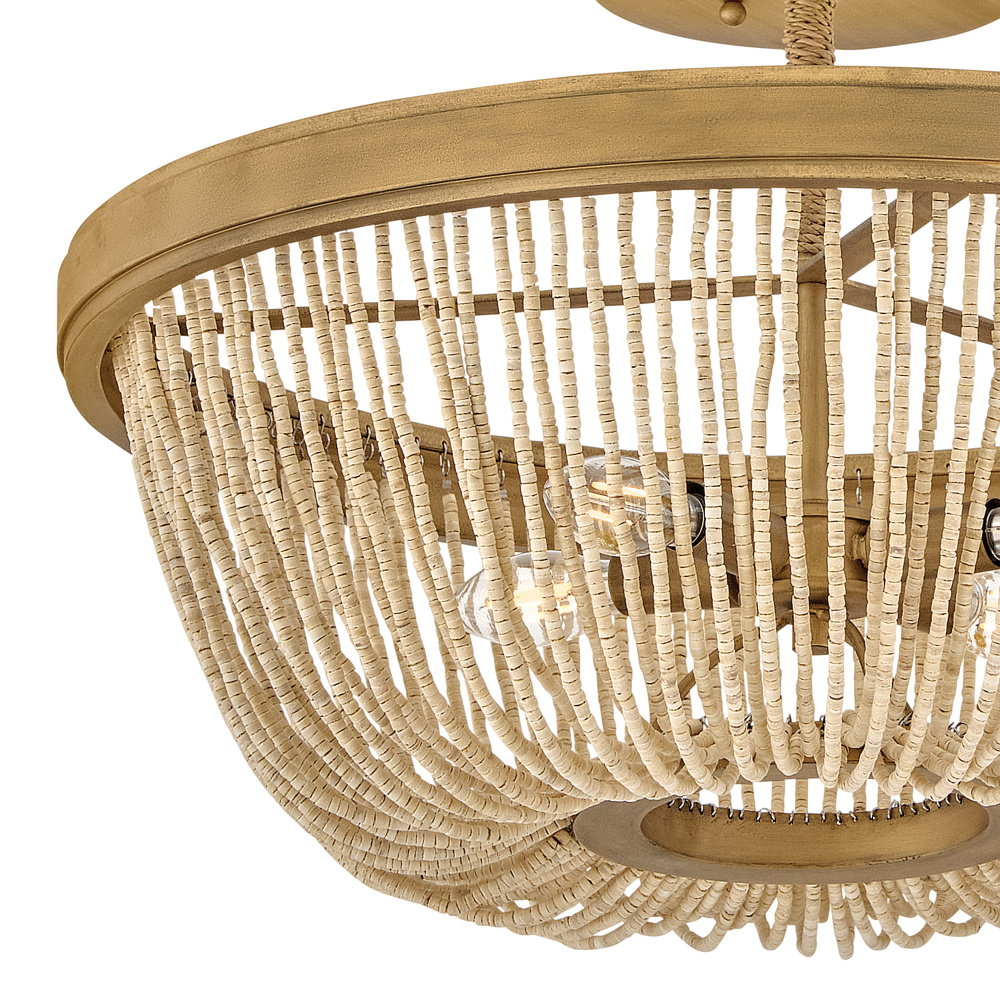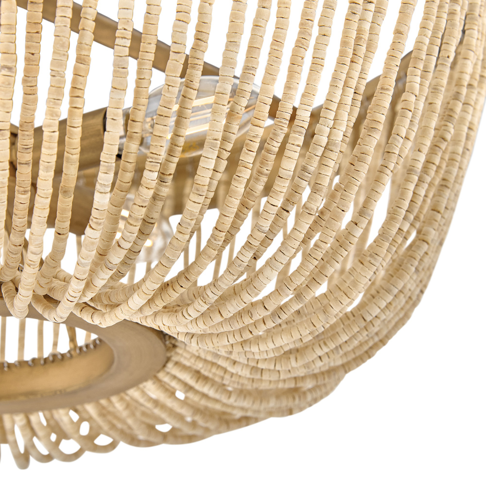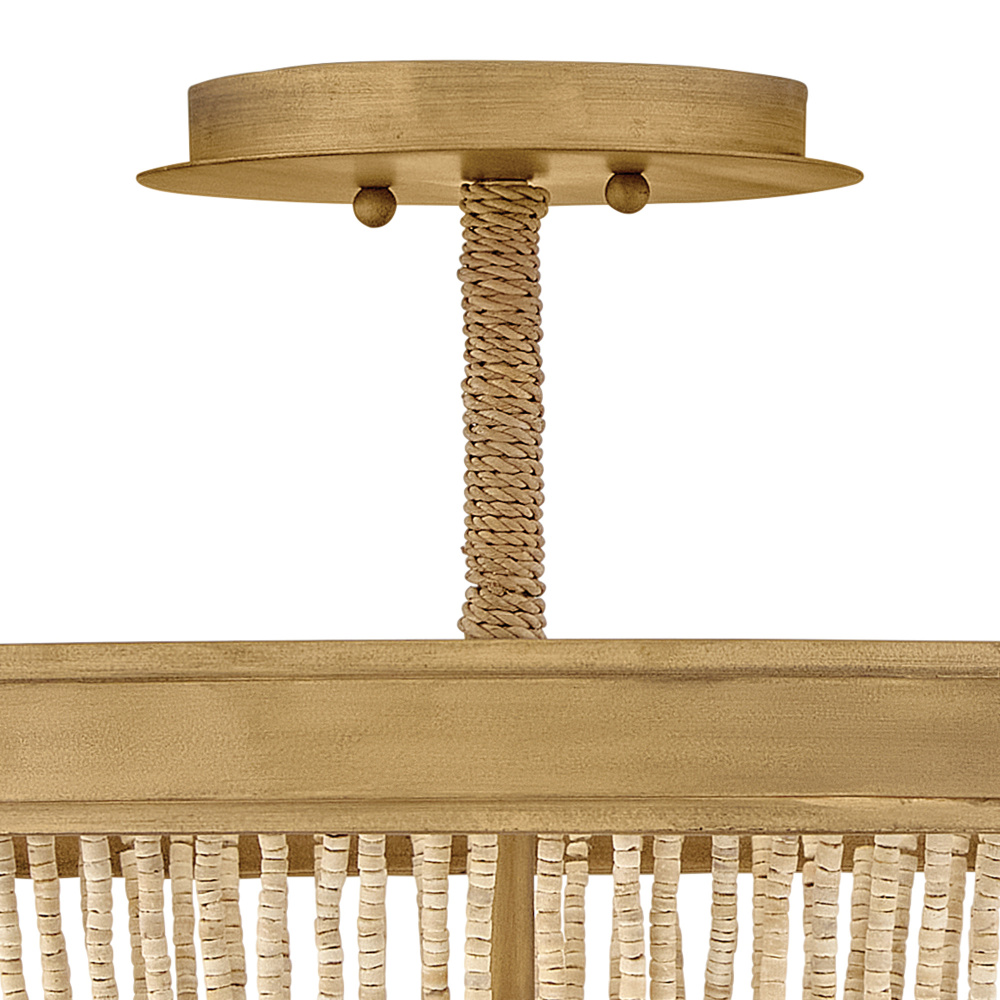 Introduce an element of natural texture and bohemian style to your living space. Tula’s artisan-crafted basket shade is hand-strung with draped strands of coco beads, creating a sheer curtain through which the warm light shines across your room. A hand-painted transitional frame suspended from decorative arms wrapped in natural fiber rope features a Burnished Gold finish with brushed distressed detailing that adds visual depth to the design.