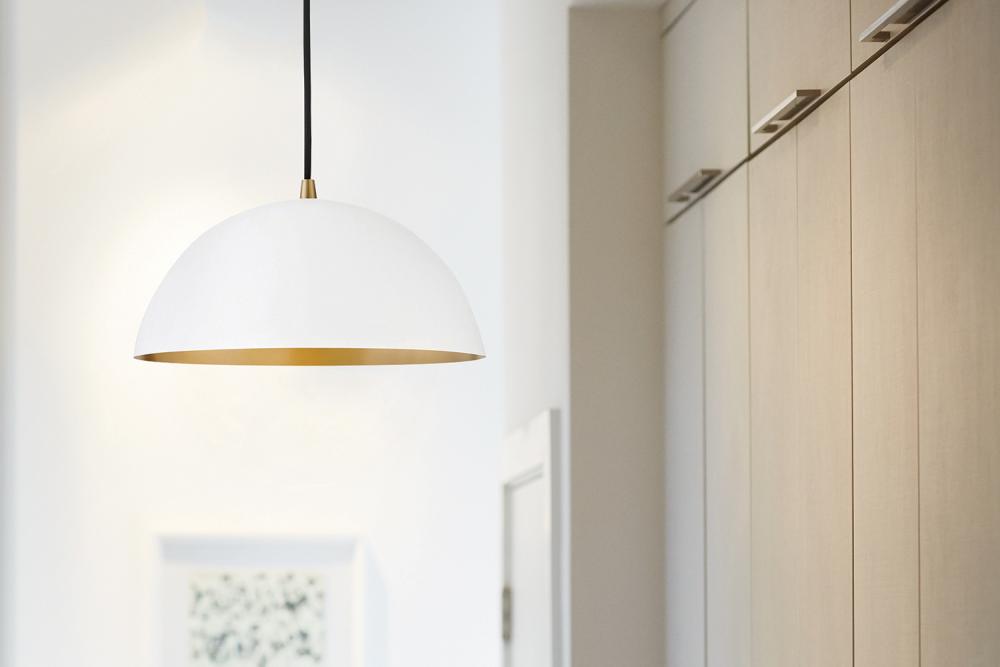 Talk about minimalist style with major impact. Lou’s sleek dome-shaped pendant has an industrial streak balanced with a dose of mid-century modern drama. Black or Matte White metal finish options contrast with the shade’s inner Lacquered Brass finish, making Lou pretty on the inside too. Lou comes cord hung and can be adjusted to any height you desire.