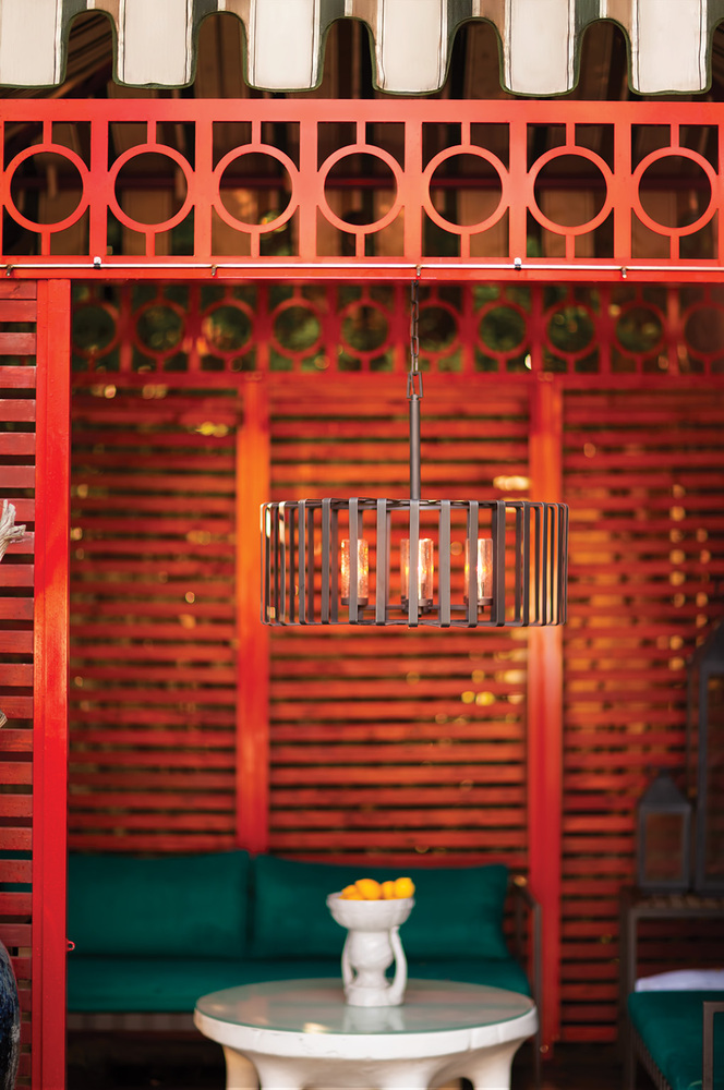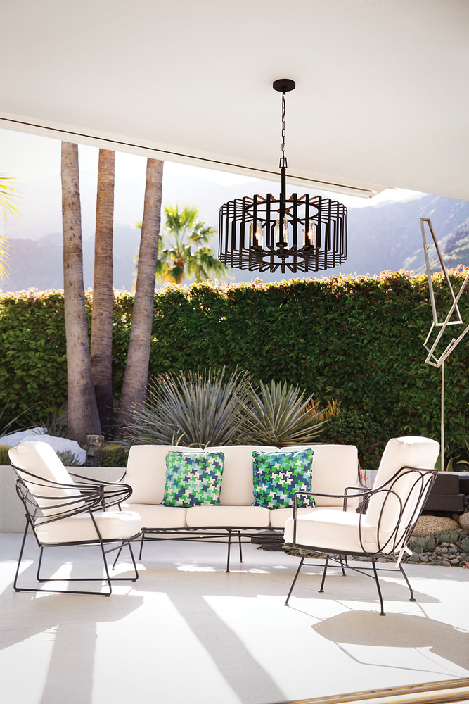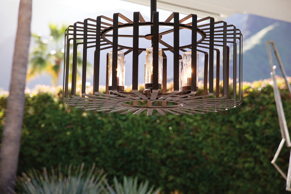 Reid uses an iconic profile featuring an airy, open cage to capture the center of attention. A candelabra with clear seedy glass columns highlights the transitional style, making it a modern mix of classic and contemporary. Weather-resistant metal with a Brushed Graphite finish complements any space, inside or out.