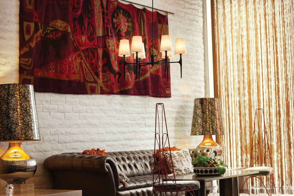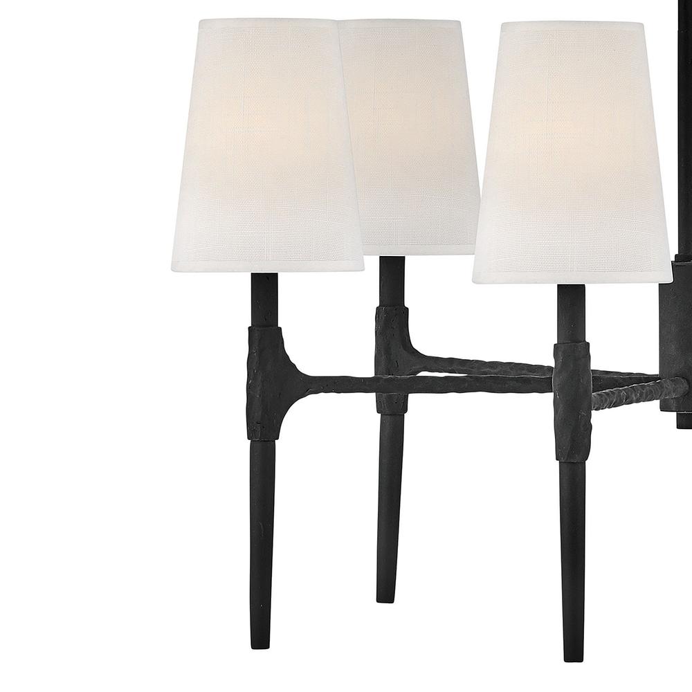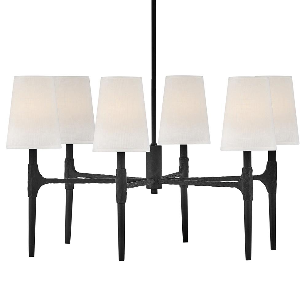 Sleek candle arms topped by softly tapered fabric shades perfectly complement Beaumont's sturdy hand-hammered details. Rustic yet traditional, the stylish transitional silhouette works well in any setting, from classically elegant to chic and modern.