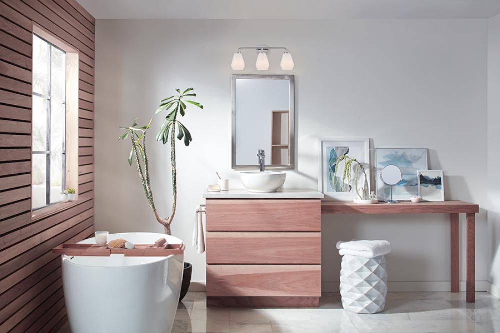Subtle geometric elements find harmony within the sleek, curved lines of Gio. The cased opal glass covers the space in functional, diffused light while providing a nice contrast to the bold variety of finish colors. Gio’s transitional glam design and clean profile add to any bath décor.