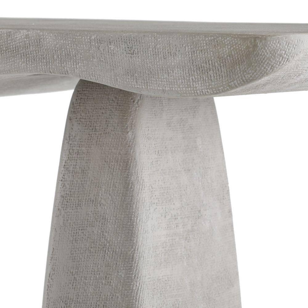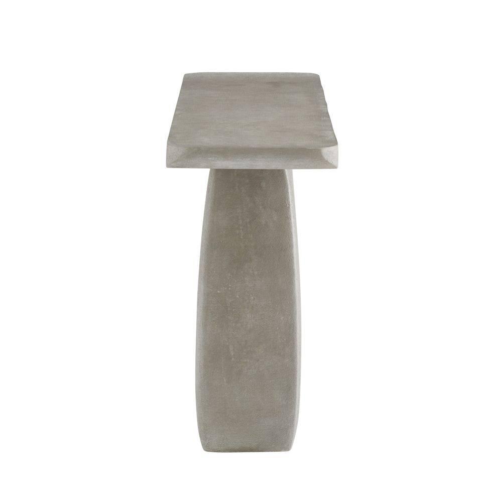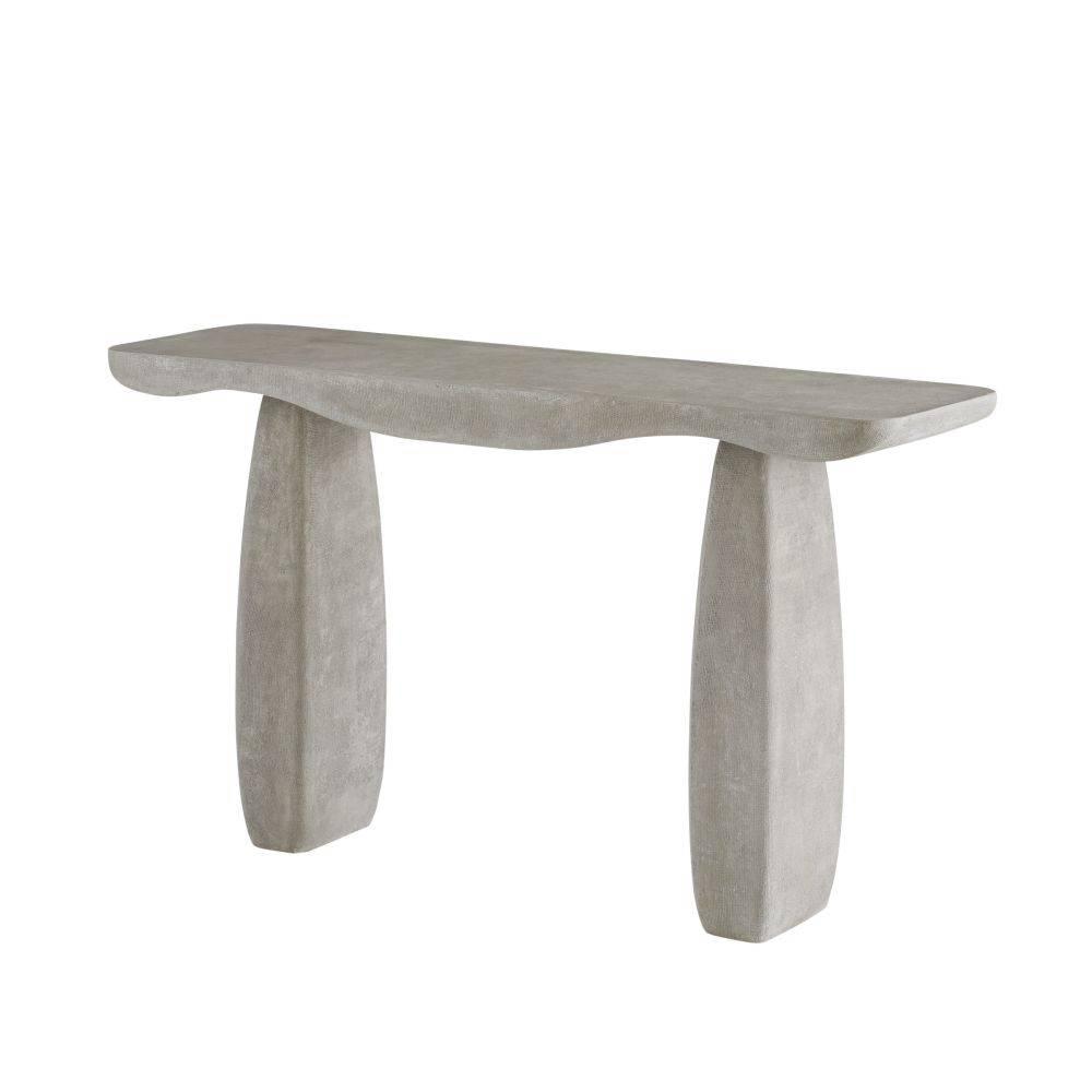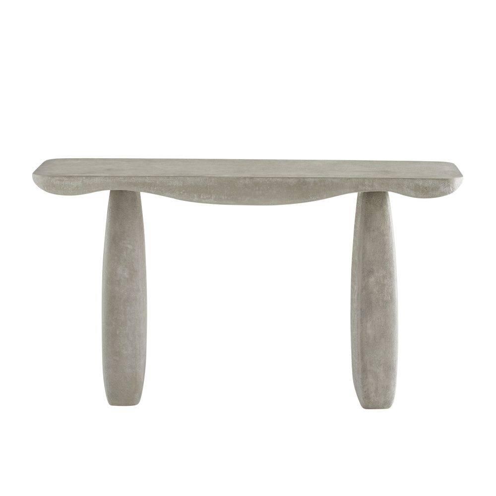 The Melt Outdoor Console’s simple planar top, gently curved on the underside where it meets each of its supporting pillars - appear to be caught mid-transformation. The smoke concrete composite is streamlined, flat top, carved beneath as if it were touched by heat and caught mid-melt, has a flowing, draping quality that feels fresh and modern in its contrasts. Finish will vary.