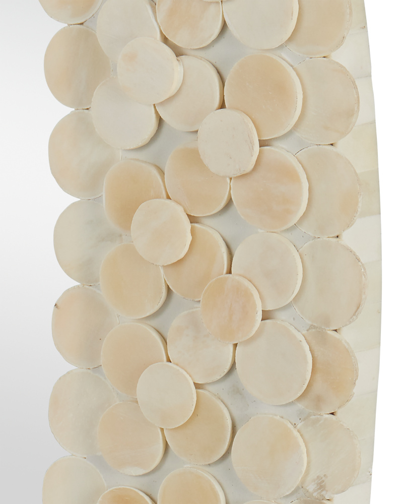 The Merriam Oval Mirror has an lovely frame fitted with over 200 hand-ground buffalo-bone discs. The color variations in the delicate bone bring this ivory decorative mirror a textural interest, while the painstaking placement of the circlets brings it a sophisticated feel. There is no bevel on the mirror.