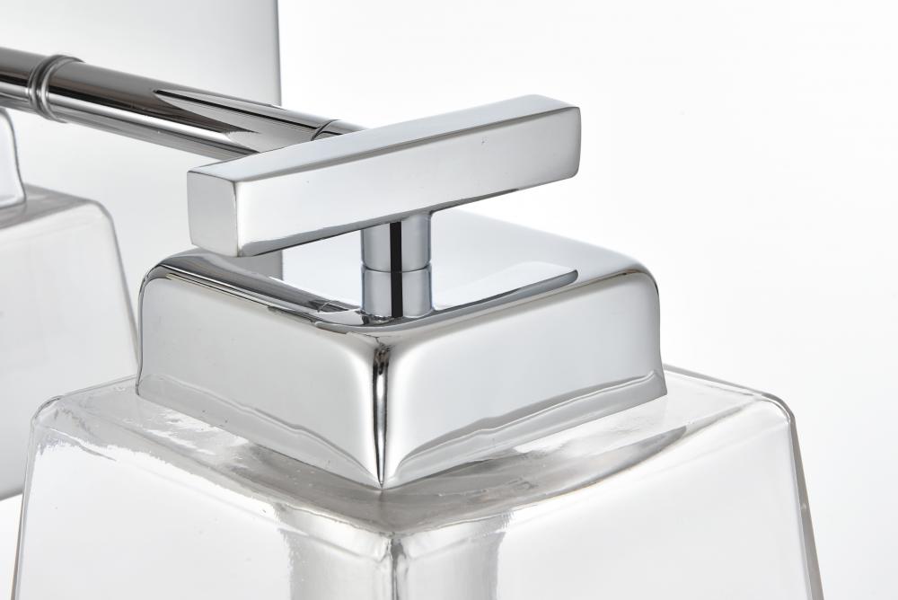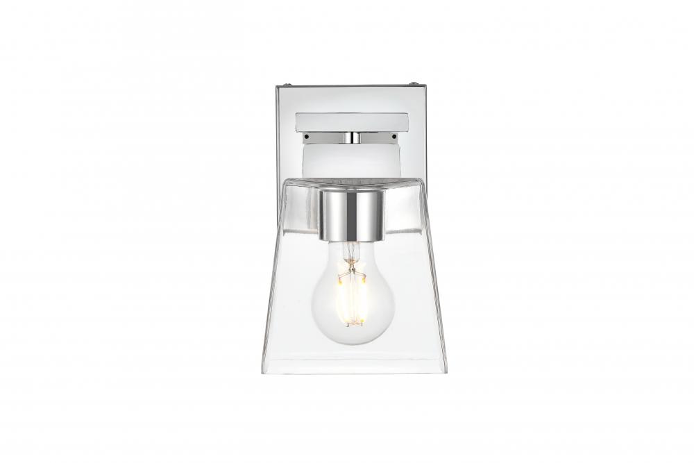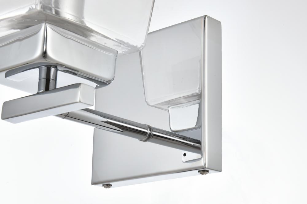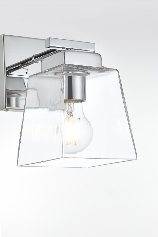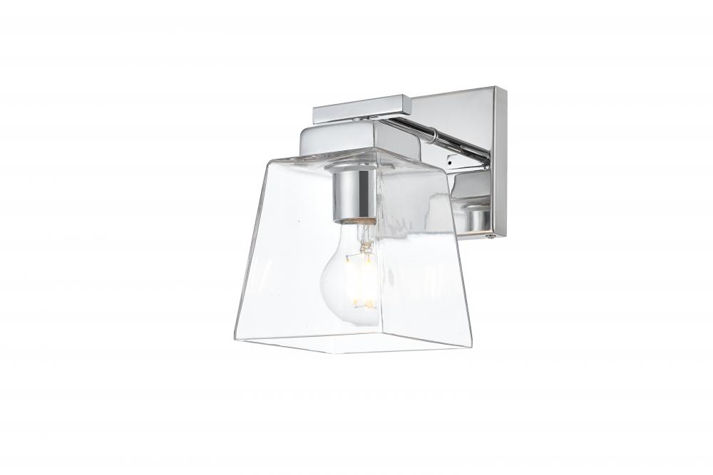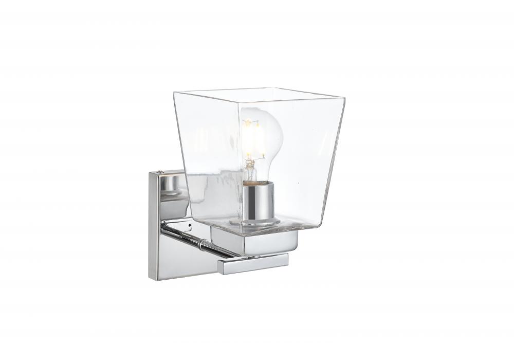 Defined by a sleek metal arm extends to suspend the clear bell glass shade. A contemporary stunner, it shows off the straight line details from the backplate and the streamline thin metal arm. Compatible with dimmers, so you'll have the right amount of light in any given time of the day. Completely versatile, you can place this wall light as an uplight or downlight. Rated for use in damp locations, this will work perfectly over a vanity in your bathroom.