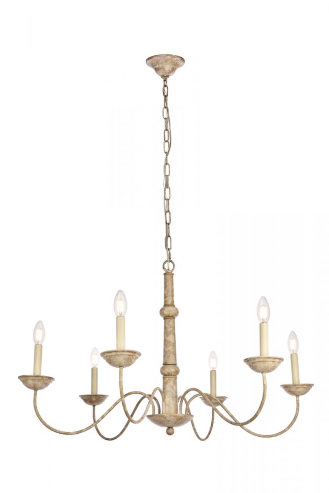 Bring warmth into your dining room, entry, or bedroom with the artisan-inspired Merritt collection. It features a candle-style chandelier with an intriguing finish that makes the Metal look like wood. A striking column dissected by two rounded segments connects to undulating arms displaying candle cups and six lights (Not included). All are coated with a lovely patina to create visual interest. Add a comforting design element into your space with these fixtures, which can be adjusted. They come in heights from 84 to 86.4 inches.