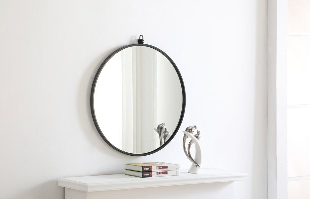 Enhance the appeal of your home or office with this black contemporary mirror featuring a thin rounded metal edges in a deep profile, reflecting a minimalist's design and trendy styling. To ensure your home safety, we use a metal hanger ring that are securely welded to the back of the metal frame , which sit on top of the frame for easy hanging. We recommend using suitable heavy duty picture/mirror hooks, selecting the best type of fixing for the particular wall you wish to hang the mirror on, using the appropriate rawl plug if required. Measurement: D24.