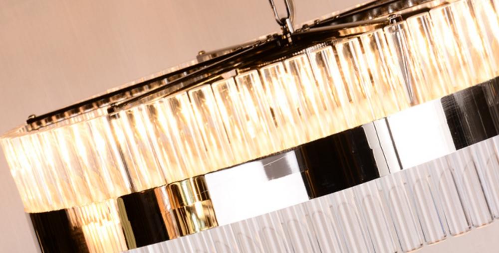 Great pendant lighting can transform a foyer, dining room or living area with a quick flip of the switch. Our large 24" diameter Metro pendant features contemporary lines of clear glass-like tubes made from acrylic arranged into drum-shaped rows. Wrapped with a Dark Chrome band, and finished with Smokey Chrome accents, the large Metro pendant takes 9 candelabra based bulbs. A white diffuser creates an even light spread ideal for illumination above a kitchen island or dining space. Charming and simple, this pendant's design story is being told with texture and beautiful finishes.
