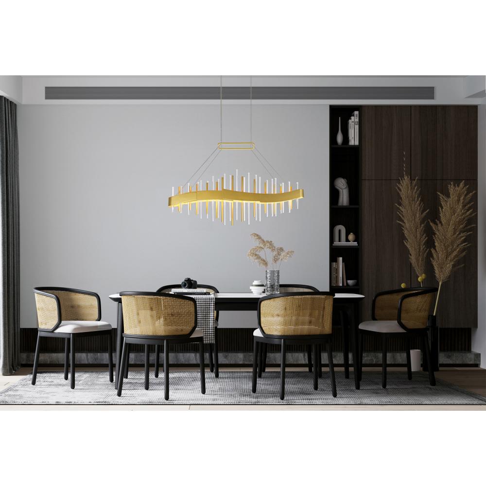 Define your space with sculptural elegance using the Millipede 40-Inch Integrated LED Chandelier in Satin Gold. This sophisticated lighting fixture features a curved rectangular metal frame adorned with clear and gold glass tubes along both the top and bottom edges. Designed for modern interiors, it emits a warm, luxurious glow while adding a refined architectural presence. Ideal for dining rooms, living areas, or entryways, this chandelier makes a stylish focal point.