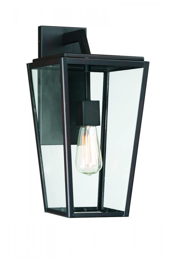Sleek, contemporary, and welcoming light is all yours with the Milton outdoor wall lantern. It’s a fresh, modern take on a classic, tapered-box lantern, with clean lines and an angular, geometric silhouette. The streamlined frame has a rich, dark, English bronze finish, and pristine, clear glass panes. It’s an impeccable complement to other hardware and materials on the exterior of your home. Within the lantern panels, one 60W, E-style bulb illuminates the area —and this fixture is UL rated for damp locations, too. It measures 8” wide and 17” high, extending 10” from the wall: perfect to add chic lighting to the walls of your patio, porch, sunroom, or other covered outdoor living areas.