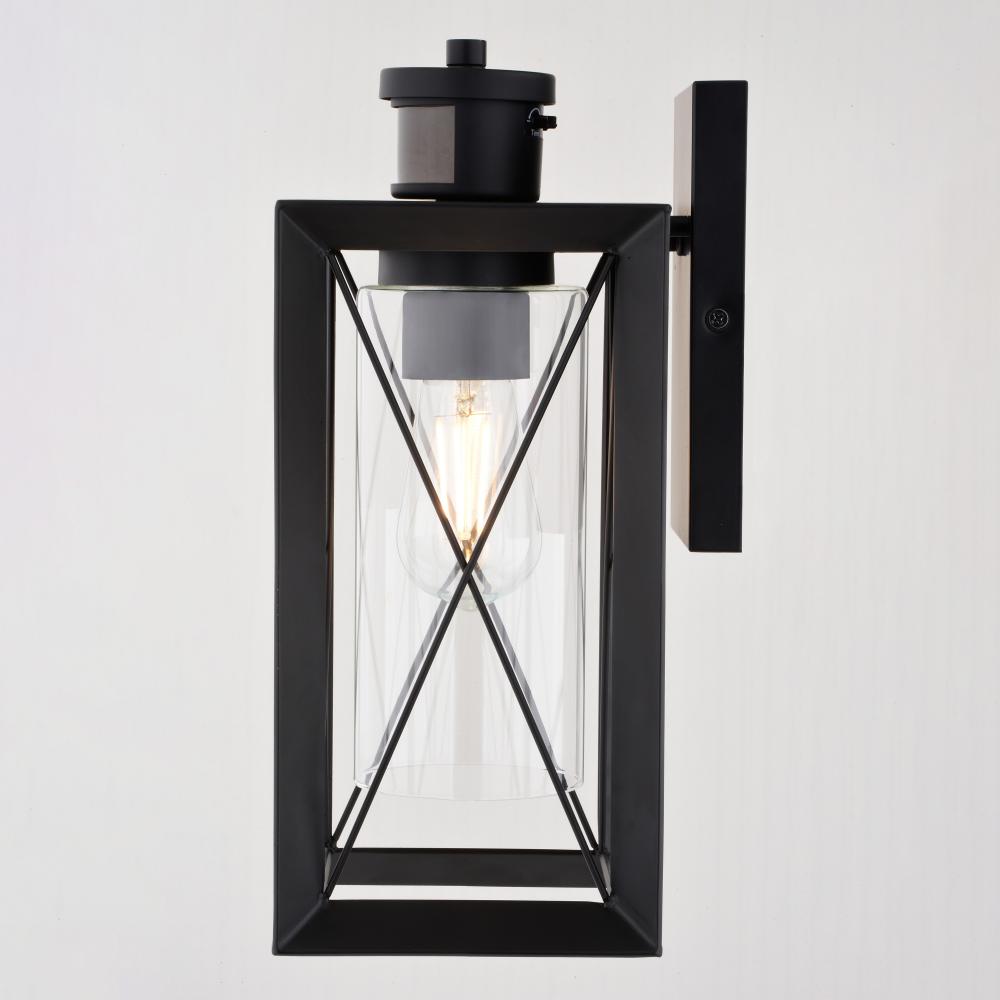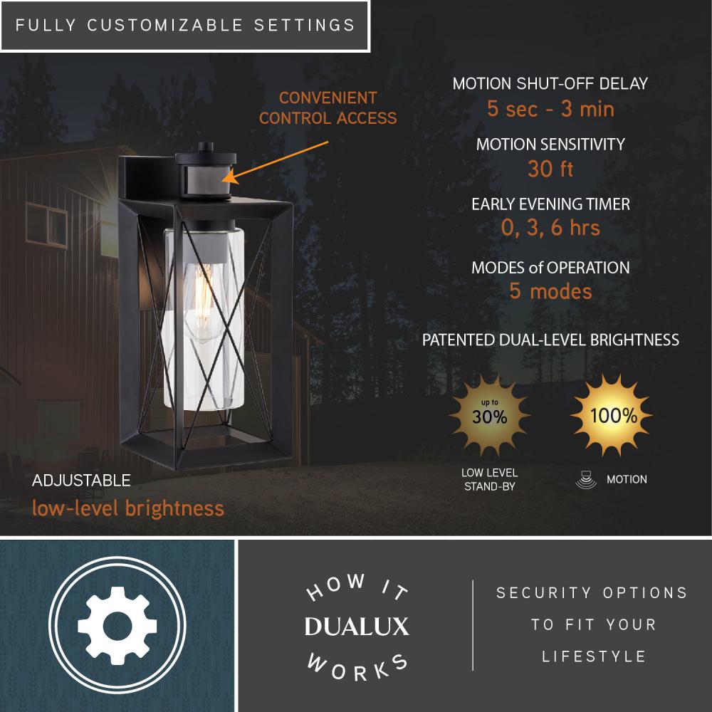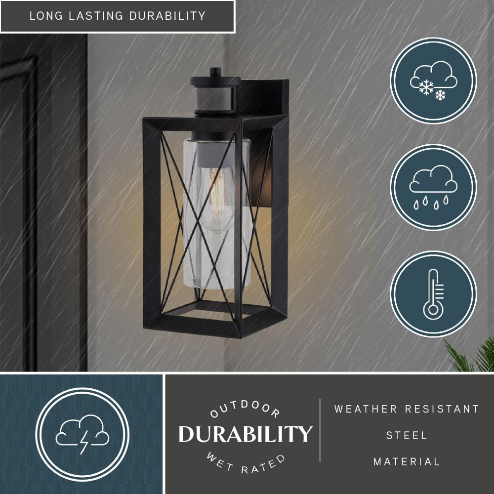Bring modern industrial style to your home's exterior with the sleek, matte black Milton outdoor wall light. Its classic X design and clear glass shade create a timeless look. The integrated Dualux motion sensor provides added security and the EZ-set sensor control enables easy customization. Perfect simple, stylish, and safe lighting solution for your front entry, back patios or to frame out your garage door.