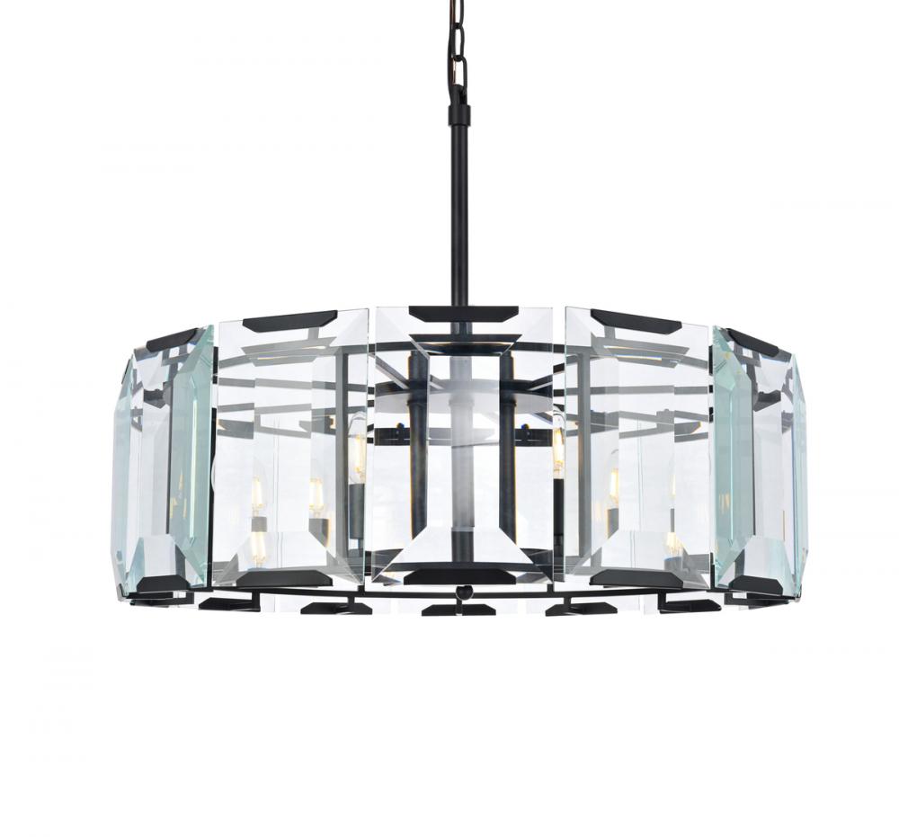 An eternity of reflection with exotic flair, Monaco chandeliers will bring illumination to your kitchen, office, or dining room, Brilliant emerald-cut glass panes capture and magnify the soft gleam of exposed bulbs. Rectangular or circular steel frames available in flat-black or golden-iron finishes give these lamps distinguished appeal.