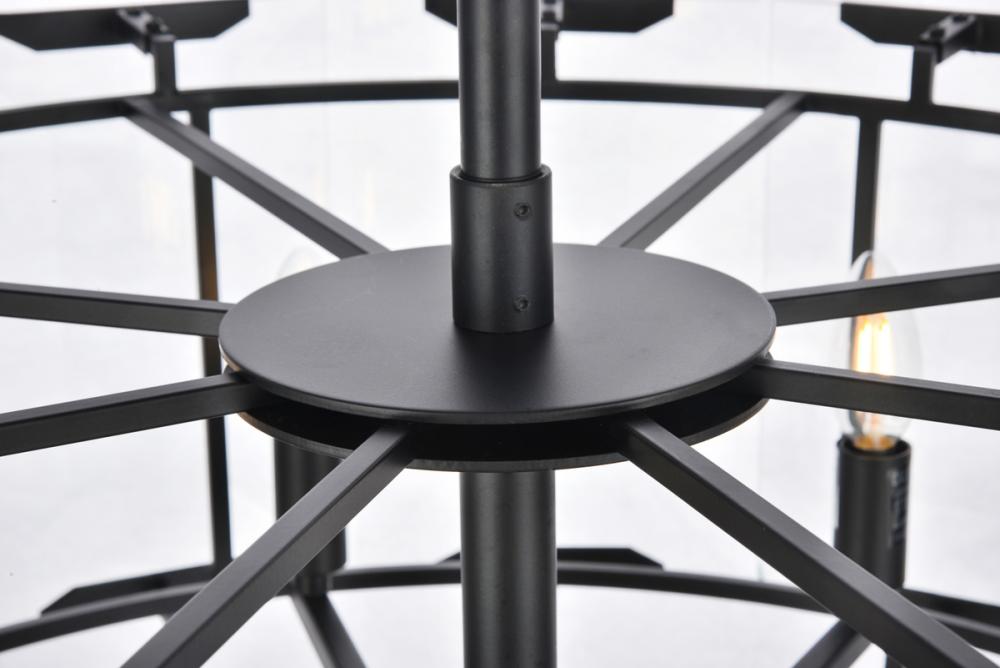 Lamp features a diameter of 30 inches, a height of 12 inches, a minimum hanging length of 18 inches, a maximum hanging length of 72 inches, and requires 8 candelabra bulbs