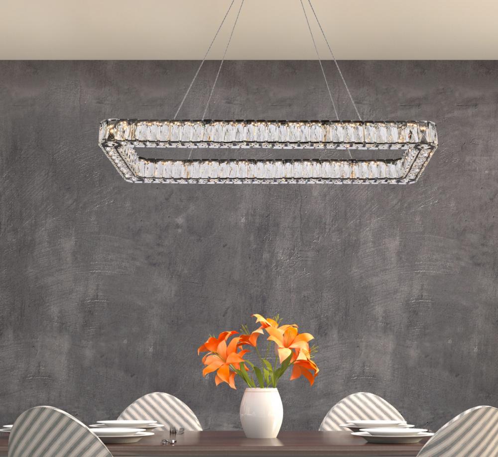 Diamonds are a girl’s best friend, and sparkling Monroe collection hanging fixtures take Marilyn’s famous lines to heart … for women and men alike. A minimal stainless-steel frame becomes dazzling when it is covered entirely with rectangular and square spectacularly faceted clear crystals. The oblong design hangs from almost invisible wires with brilliant integrated LED shining unseen from within. Stunning when placed in a dining room, kitchen, living room, or bedroom.