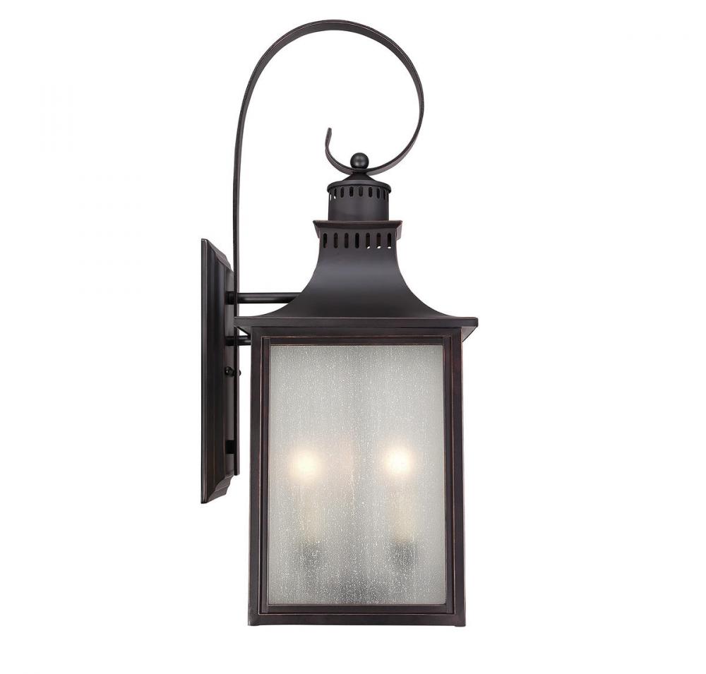 The Savoy House Monte Grande 3-light outdoor wall lantern is an elegant, clean-lined version of a classic box-shaped lantern. It’s a timeless and pleasing style from designer Karyl Pierce Paxton, a wall lantern that will illuminate the exterior of your home and welcome you and your guests with a familiar, traditional aesthetic. The English bronze finish is a wonderful neutral and the panels are made of beautiful pale cream seeded glass. Three 40W candelabra size bulbs provide plenty of soft light. This lantern is 10" wide, 26.75" high and UL rated for wet locations.