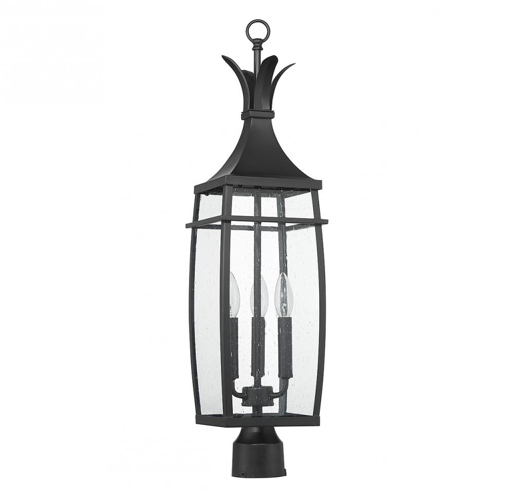 A hint of nature-inspired detailing decorates the top of this Savoy House Montpelier 3-light outdoor post light. Its slightly curved structure features panes of clear seeded glass and is finished in a classic matte black. Montpelier is 29" in height and 7.5" in width. It uses 3 candelabra size bulbs with a max of 60 watts per bulb (bulbs not included).